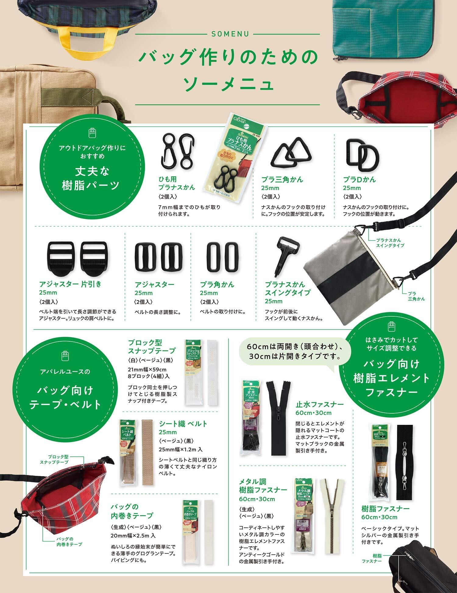 旅行やビジネス、デイリーで使うバッグをハンドメイドしませんか?そんな時重要なのがパーツ類。機能的なカジュアルバッグのソーイングにお使いください。