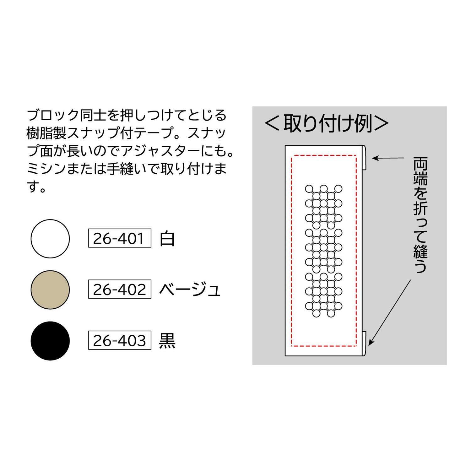 ブロック型の樹脂製スナップ付テープです。ブロック同士を押しつけてスナップのように閉じます。テープを縫って取り付けます。