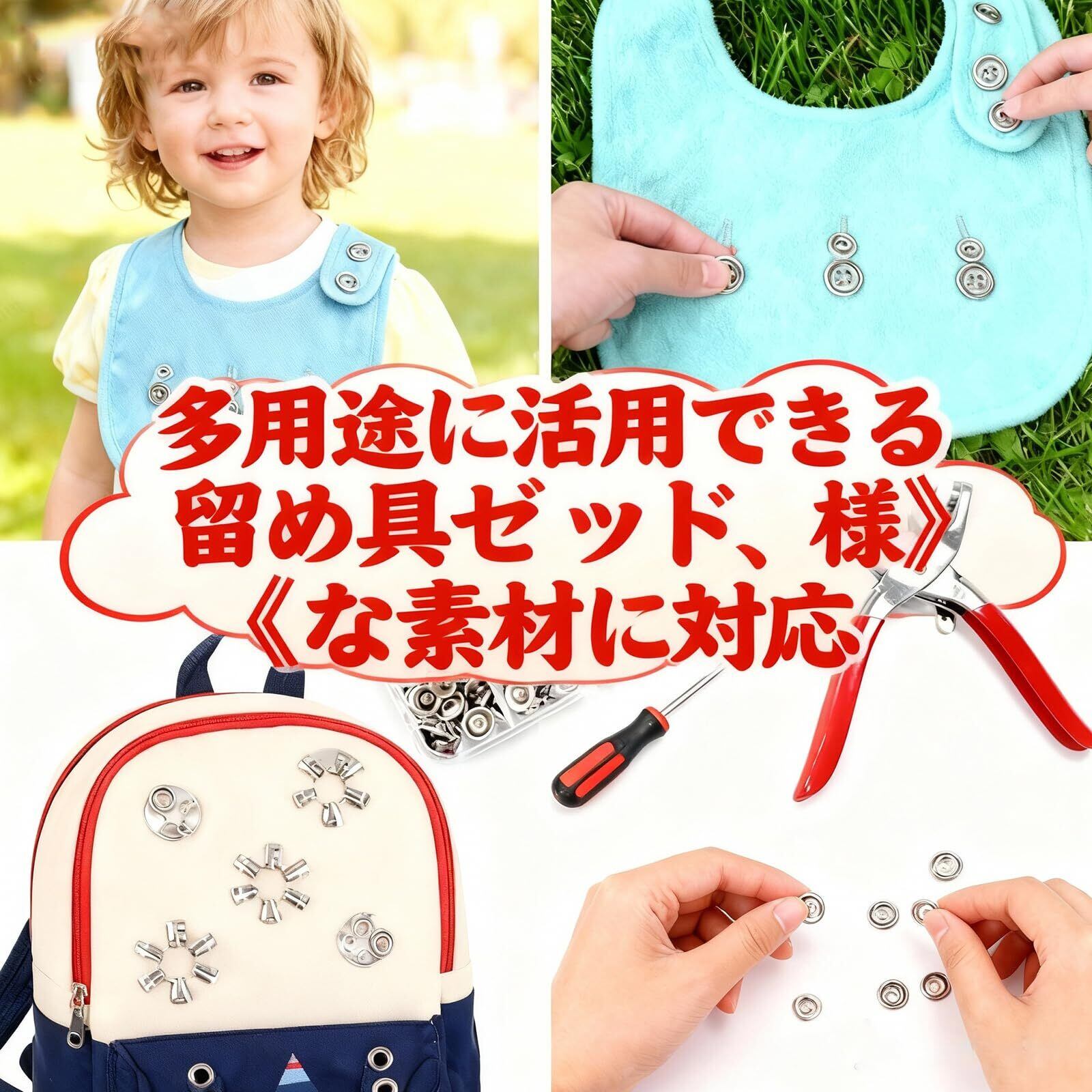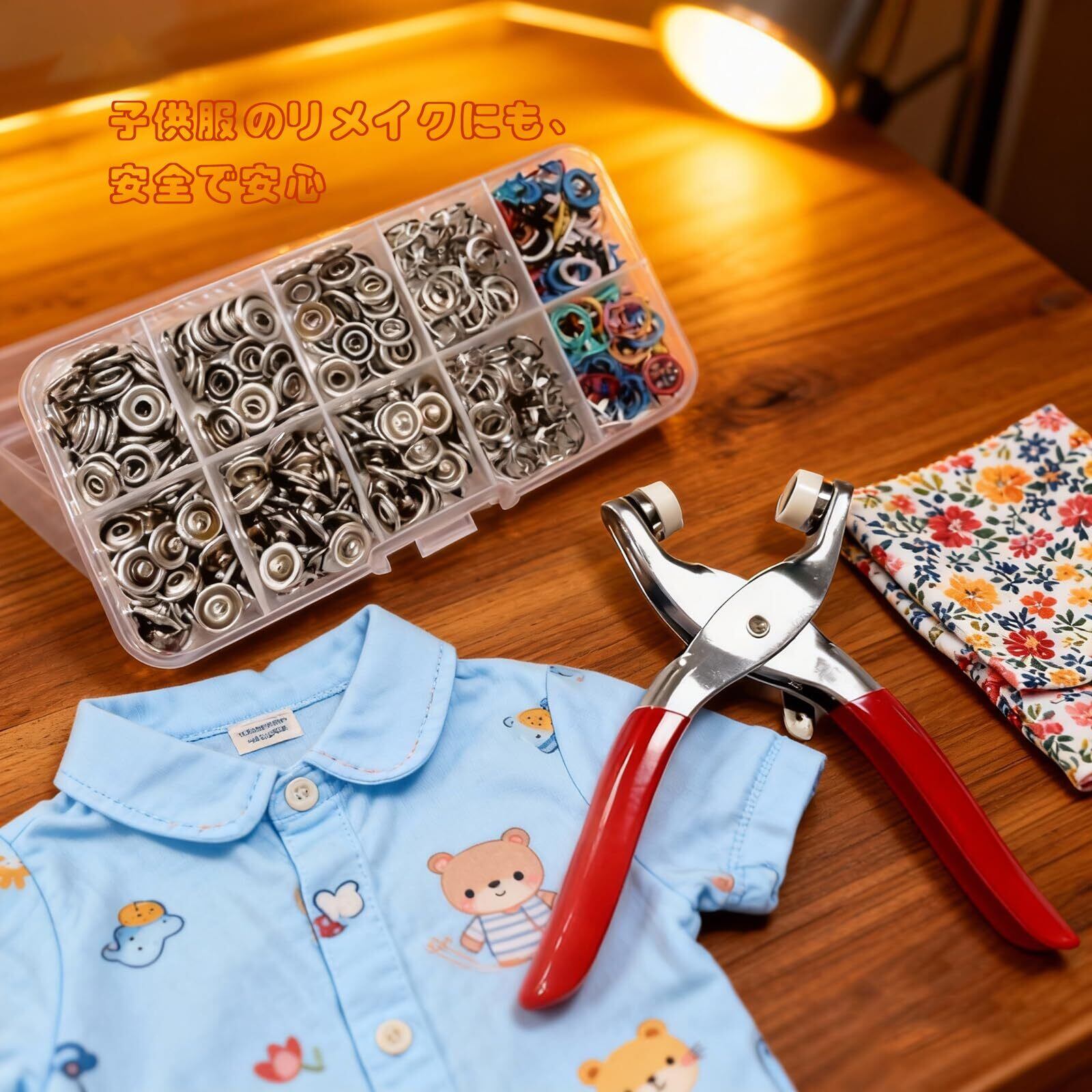 【セット内容】金属スナップボタン100個入り、サイズは約9mm。専用の金属プレス工具と便利な収納ボックスが付属し、届いてすぐに作業を始められる充実したセットです。