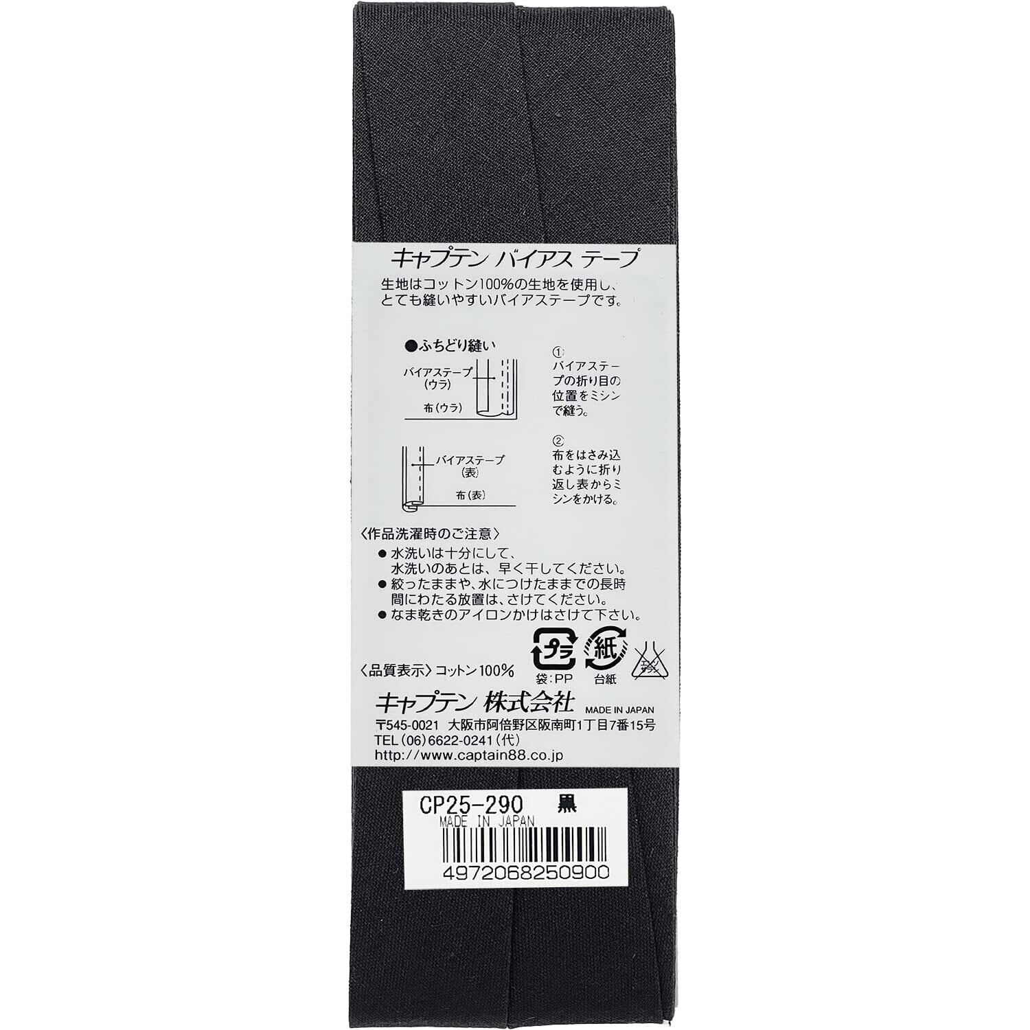 CAPTAIN88 キャプテン Hi コットン バイアステープ 両折 20mm幅×2.75m巻 #290 黒 CP25