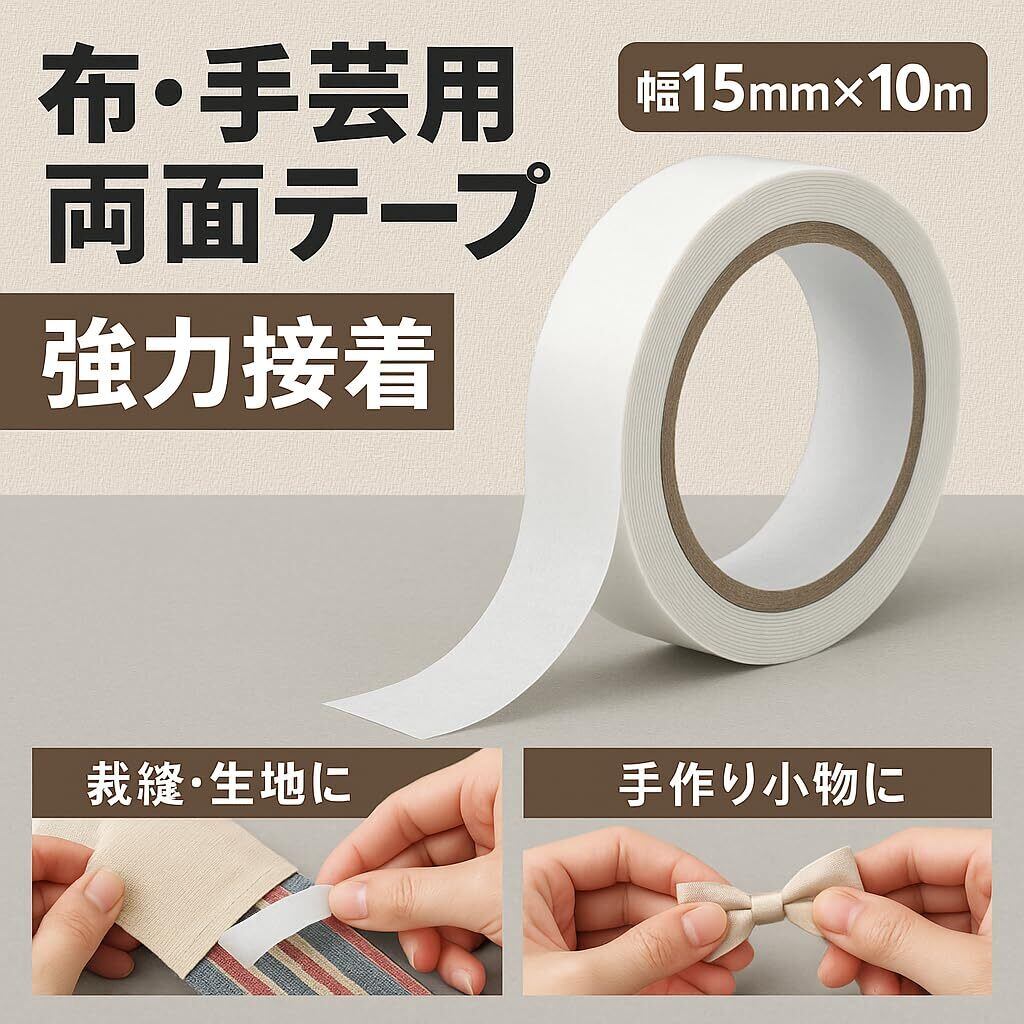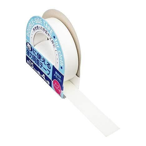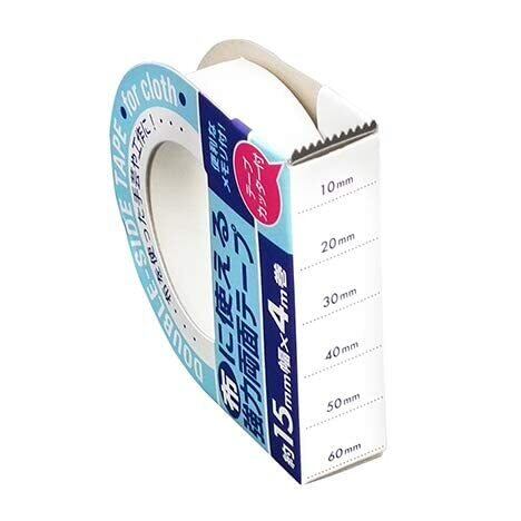 布・手芸用 両面テープ 強力接着 幅15mm×4m 裁縫 生地 手作り 裾上げ 小物 布用粘着テープ カッター付 目盛り付