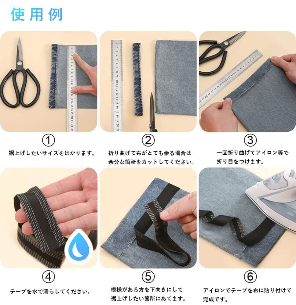 [糸も針も不要・便利]:裁縫上手 布 接着剤 裾上げテープは水で濡らして、アイロンでアイロンテープを乾かすことで、糸や針を使わずに簡単に裾上げができます。