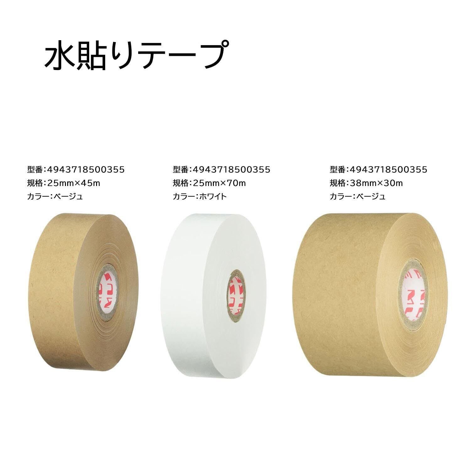 サイズ: 巾25mmx70m。素材: 紙製、のり。厚紙を組み立てる時に使う紙製の粘着テープです。のりのついてる面(光沢側)をスポンジなどで水に湿らせて使用します。