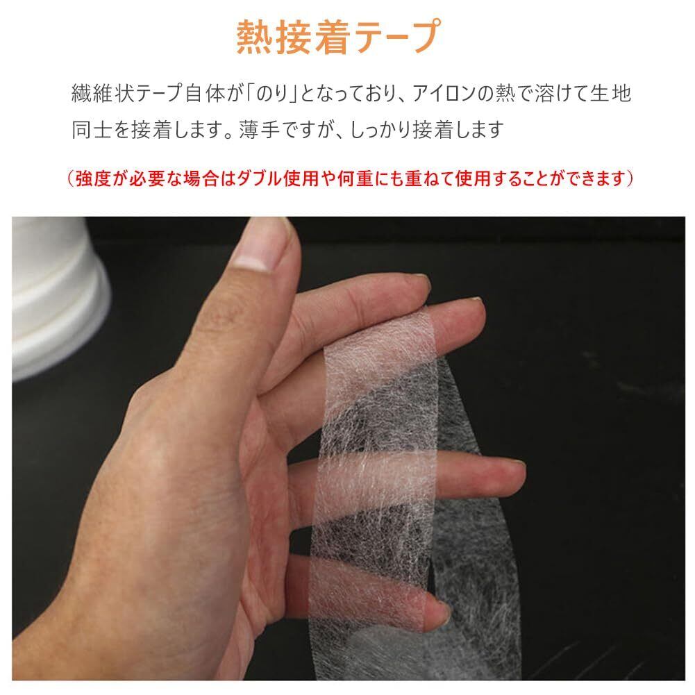 使用方法:必要な長さに接着テープをカットし、接着させたい生地と生地の間に接着テープを挟みます(接着テープを生地からはみ出ないように挟んでください)。生地の上からあて布をして、約15~20秒間、中温(140℃〜160℃)のアイロンで押さえつけます。接着後は約2~3分そのまま放置して、よく冷まします。(強度が必要な場合はダブル使用や何重にも重ねて使用することができます)