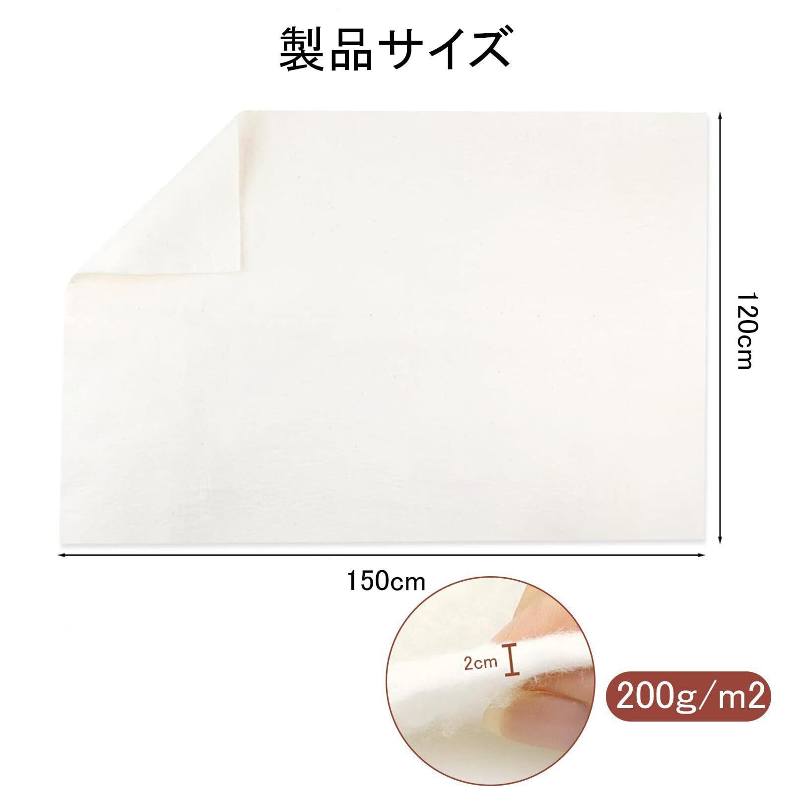 【製品仕様】キルト芯のサイズは120×150 cm、目付200g/m2、赤ちゃんの布団、毛布などの各種パッチワークに最適なサイズす。