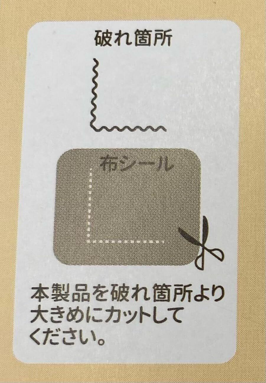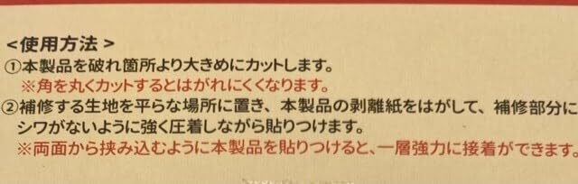 使用方法 ①シールを補修箇所より大きめにカットします。 ※角を丸くカットするとはがれにくくなります。 ②補修する生地を平らな場所に置き、剥離紙を剥がしたら補修部分にシワがないように貼りつけ、テープを強く圧着しながら貼りつけます。 ※両面から挟み込むように本商品を張り付けると、一層強力に接着できます。