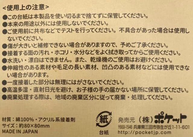 使用上の注意 ・台紙は本製品を使い切るまで捨てずに保管してください。 ・本来の用途以外には使用しないでください。 ・ご使用前に共布などでテストを行ってください。不具合があった場合は使用しないでください。 ・傷が大きいと補修できない場合がありますので、予めご了承ください。 ・接着する面の汚れ、ホコリ、水分などをよく拭き取ってからご使用ください。 ・水洗い・漂白はできません。また、乾燥機のご使用はお避けください。 ・伸縮性のある素材や毛足の長い素材、凹凸のある素材などには使用できない場合があります。 ・一度接着した部分は無理にはがさないでください。 ・水洗い、漂白はできません。簡単な汚れは中性洗剤で拭き取ってください。 ・乾燥機のご使用は、お避け下さい。 ・高温多湿・直射日光をさけ、お子様の手の届かない場所に保管してください。 ・廃棄処理する際は、地域の廃棄区分に従って廃棄、処理してください。 ・