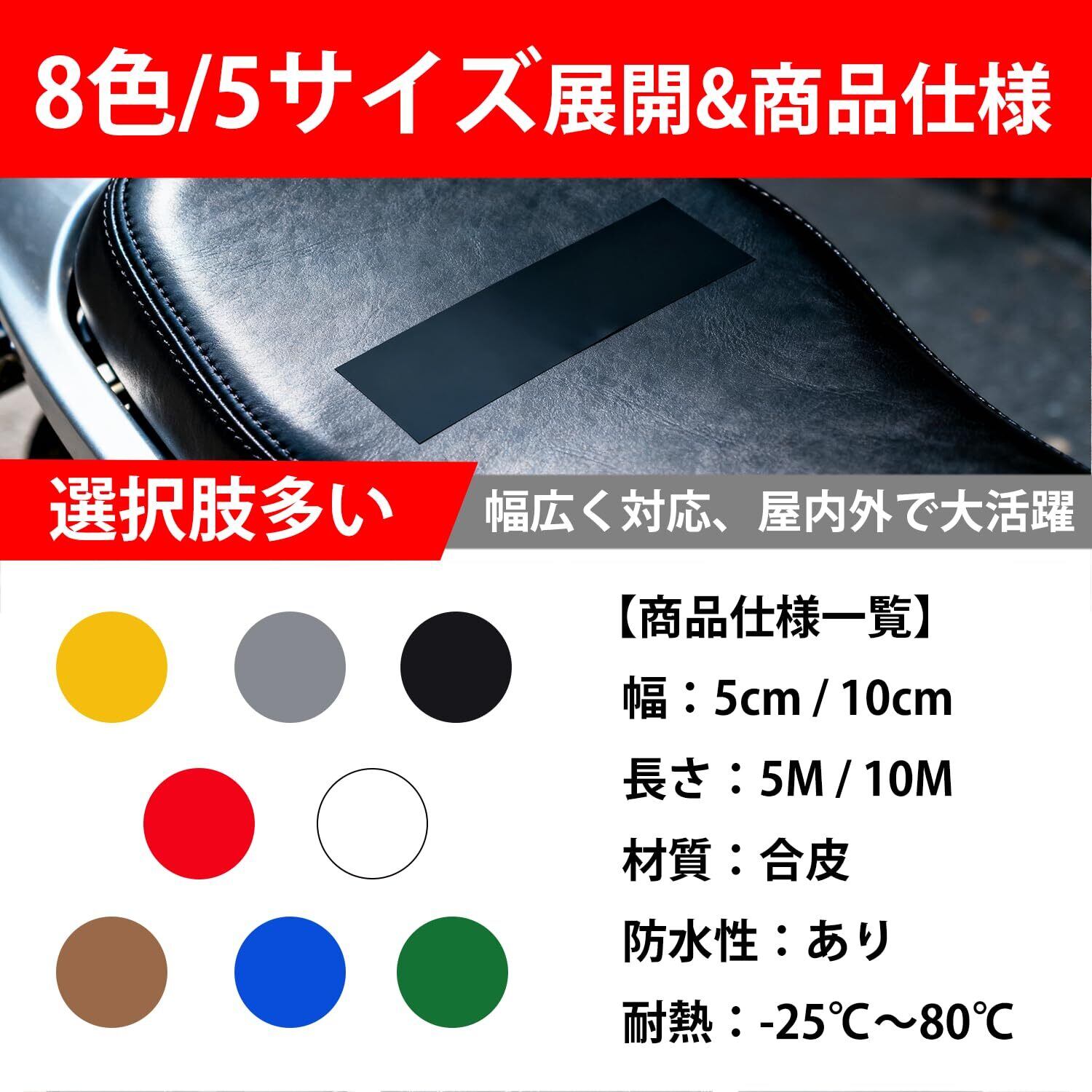 【自由にカット&サイズ・カラー豊富】幅5cm×長さ5m、幅5cm×長さ10m、幅10cm×長さ10mの3サイズ展開。ブラック、ホワイト、グレー、ブルー、グリーン、ブラウン、レッド、イエローの計8色から選べ、補修箇所に合わせて自由にカット可能。細かいバイク シート 補修から広範囲のシート補修テープ用途まで無駄なく使え、経済的でコスパにも優れています。