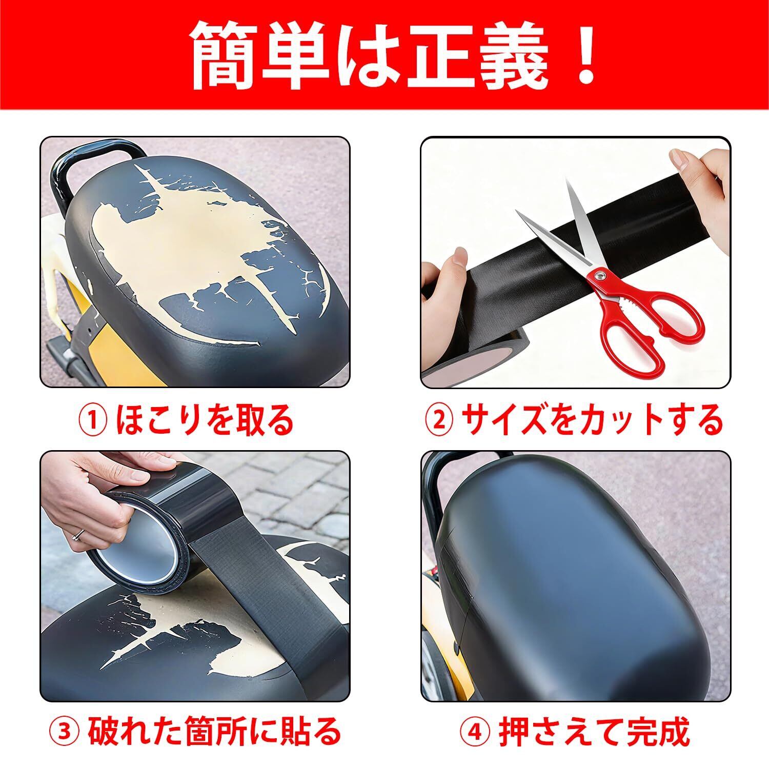 【瞬間補修!貼るだけで簡単修理】WFNRIN シート補修テープは、剥離紙をはがして貼るだけの簡単補修。革のような自然な質感で、ひび割れ、破れ、擦り傷などを手軽にカバーでき、シート修理テープとしても違和感のない仕上がりに。工具や縫製は一切不要で、バイク シート 補修や車シート補修をはじめ、初心者の方でも扱いやすく、短時間で見た目をきれいに整えられます。