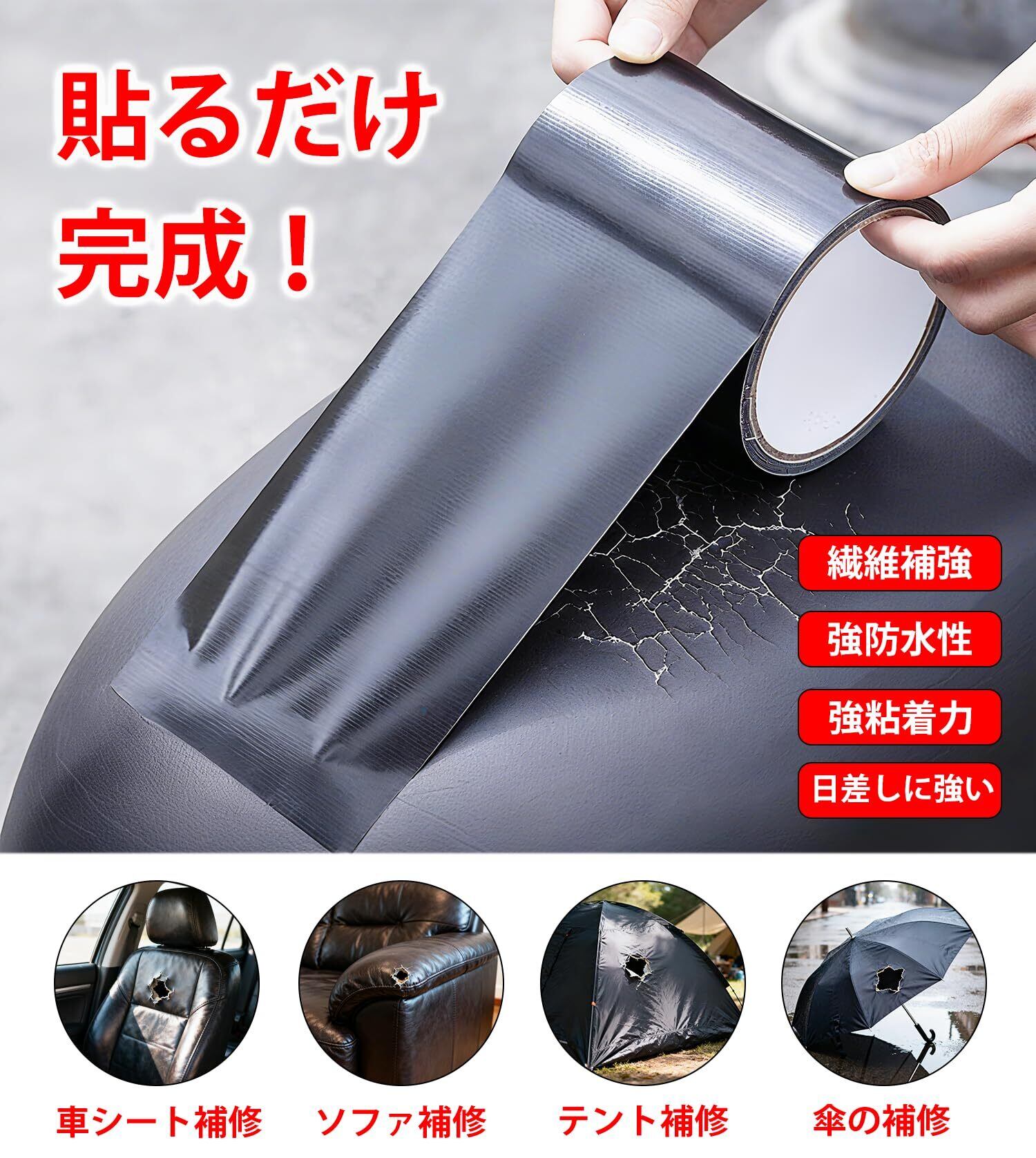 【多素材対応・屋内外で大活躍】合皮、ビニール、プラスチック、カンバスなど、さまざまな素材にしっかり密着。家庭用のソファやバッグ、手袋はもちろん、アウトドア用品、プール補修、レインコート、浮き輪、傘の補修にも対応。シート補修テープとして応急処置やDIY用途にも便利で、常備しておくと安心です。