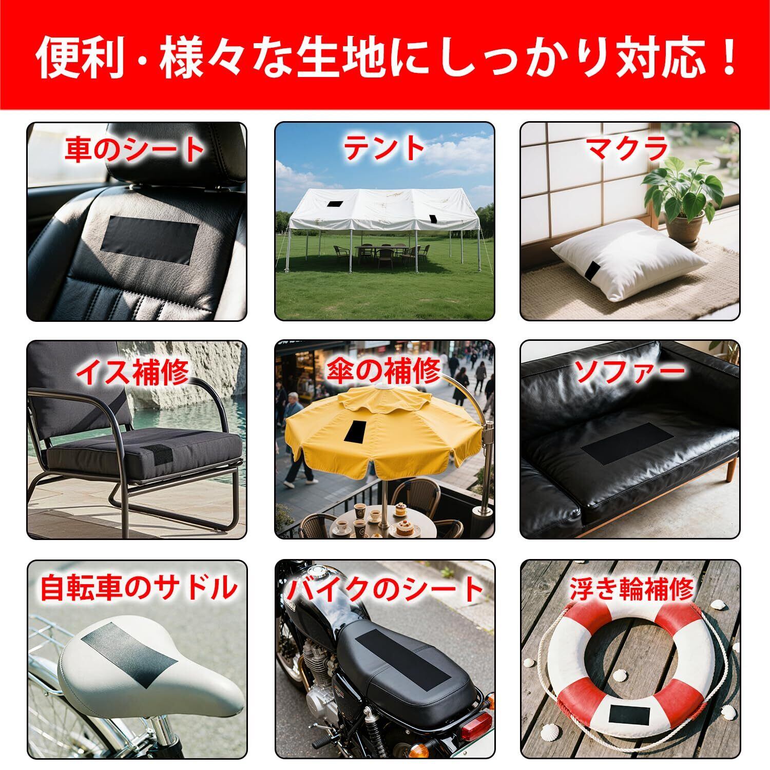 【ソファ・バイク・トラックまで幅広く対応】ソファ、テント、サドル、バイクシート、自転車の座席、車・トラックのシート、財布、家具など、さまざまな合皮製品の補修に対応。ソファー修繕シート、バイクシート補修テープ、トラックシート補修テープとしても活躍し、日常使いから業務用途まで幅広くご使用いただけます。