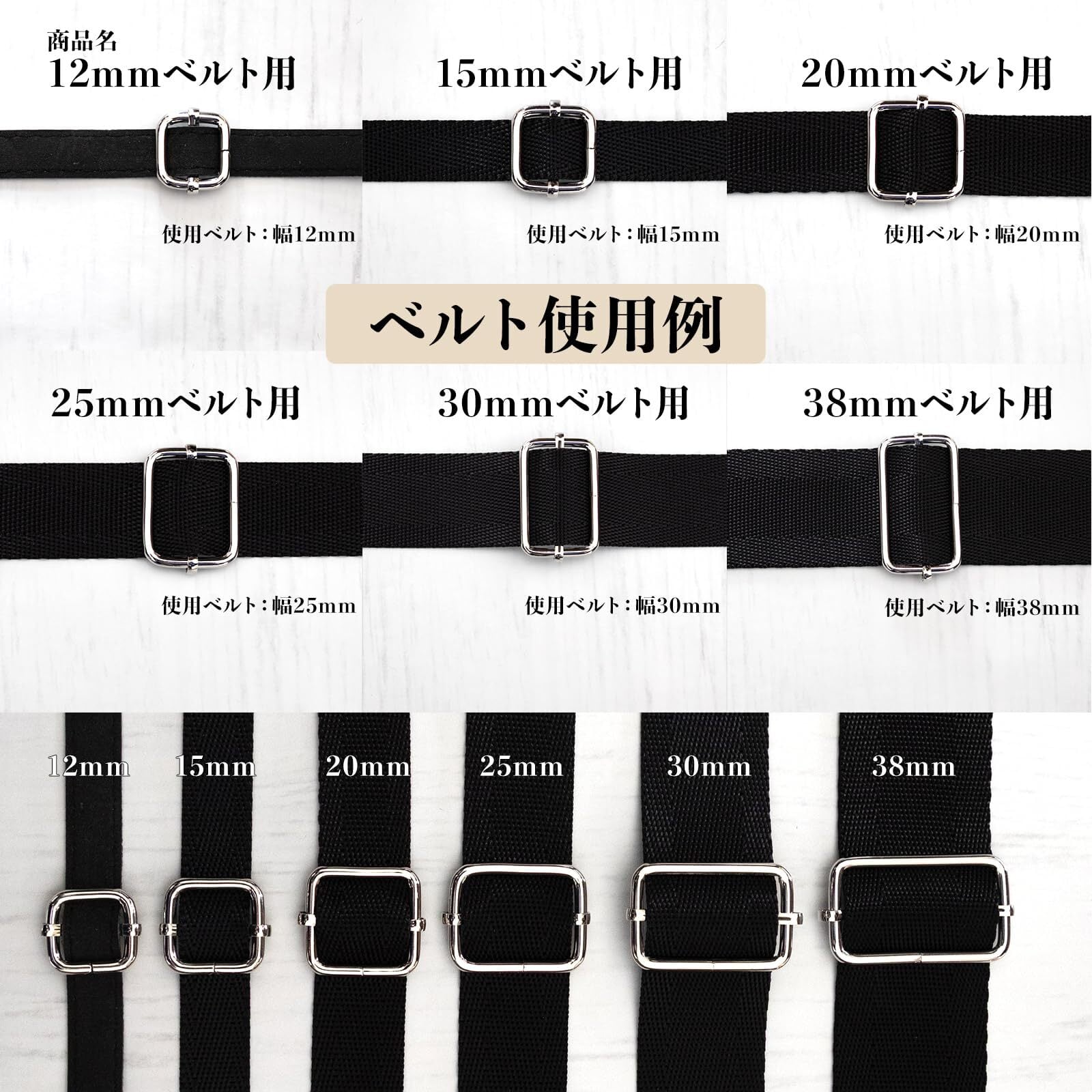 内径12mm・15mm・20mm・25mm・30mm・38mmベルト用の全6サイズ、アンティークゴールド・シルバー・KCゴールド・ブラックニッケルの4カラー展開。用途や作品に合わせてお選びいただけます。