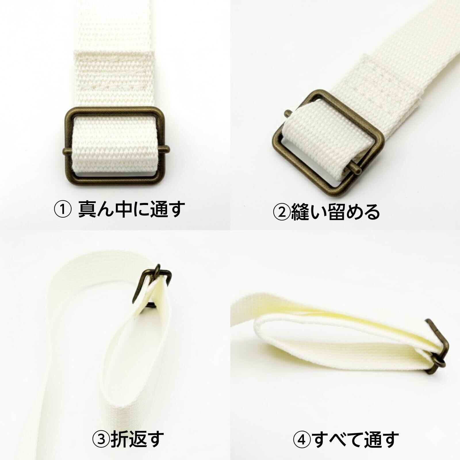 【 基本の取り付け手順】Step1.リュックカン にベルトを通す Step2.表側から中央バーをまたいで一周 Step3.裏側で折り返し、再度バーを通して固定 Step4.余りを ナスカン に縫い留める5.反対側のベルト端は Dカン(またはバッグ本体)に縫い付け