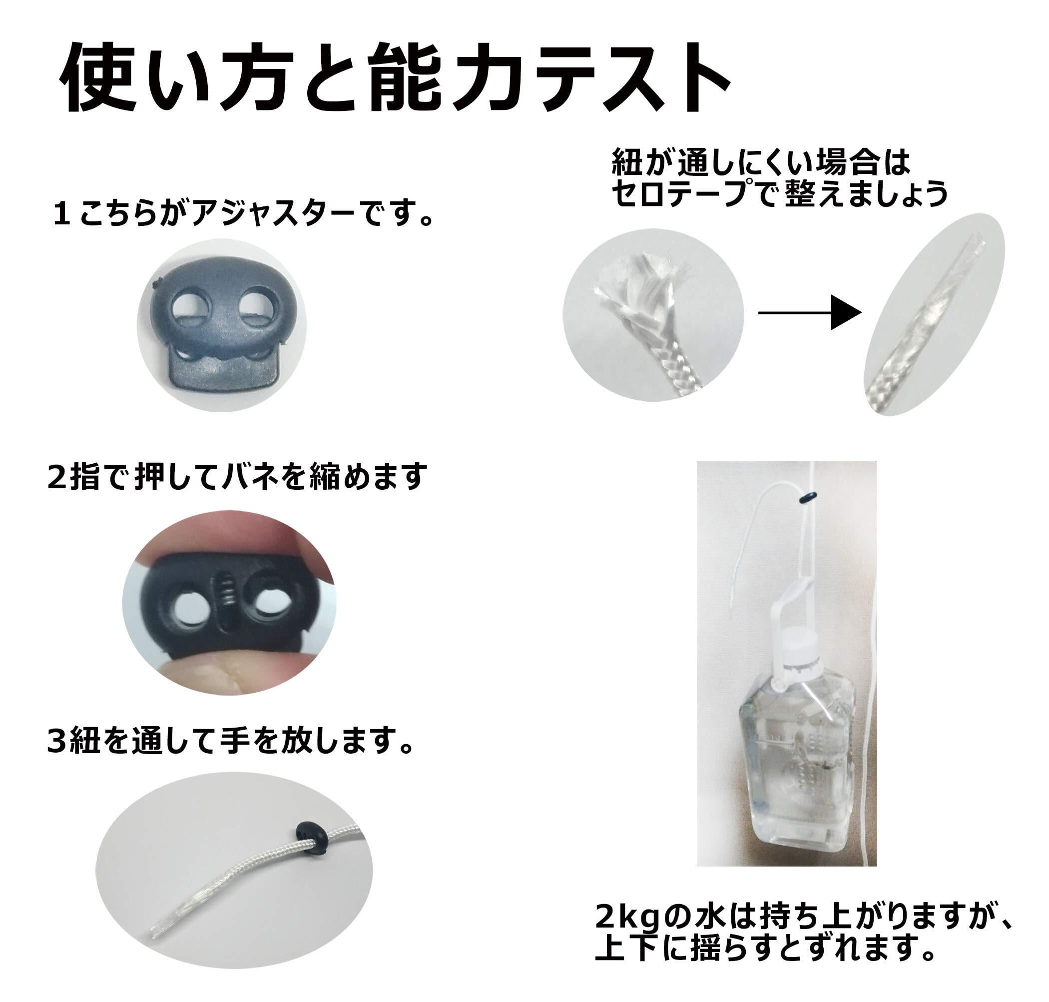 樹脂製、スプリング式です。紐の太さ・摩擦に左右されますが、穴1つ通しで1000gの静荷重に耐えられます。