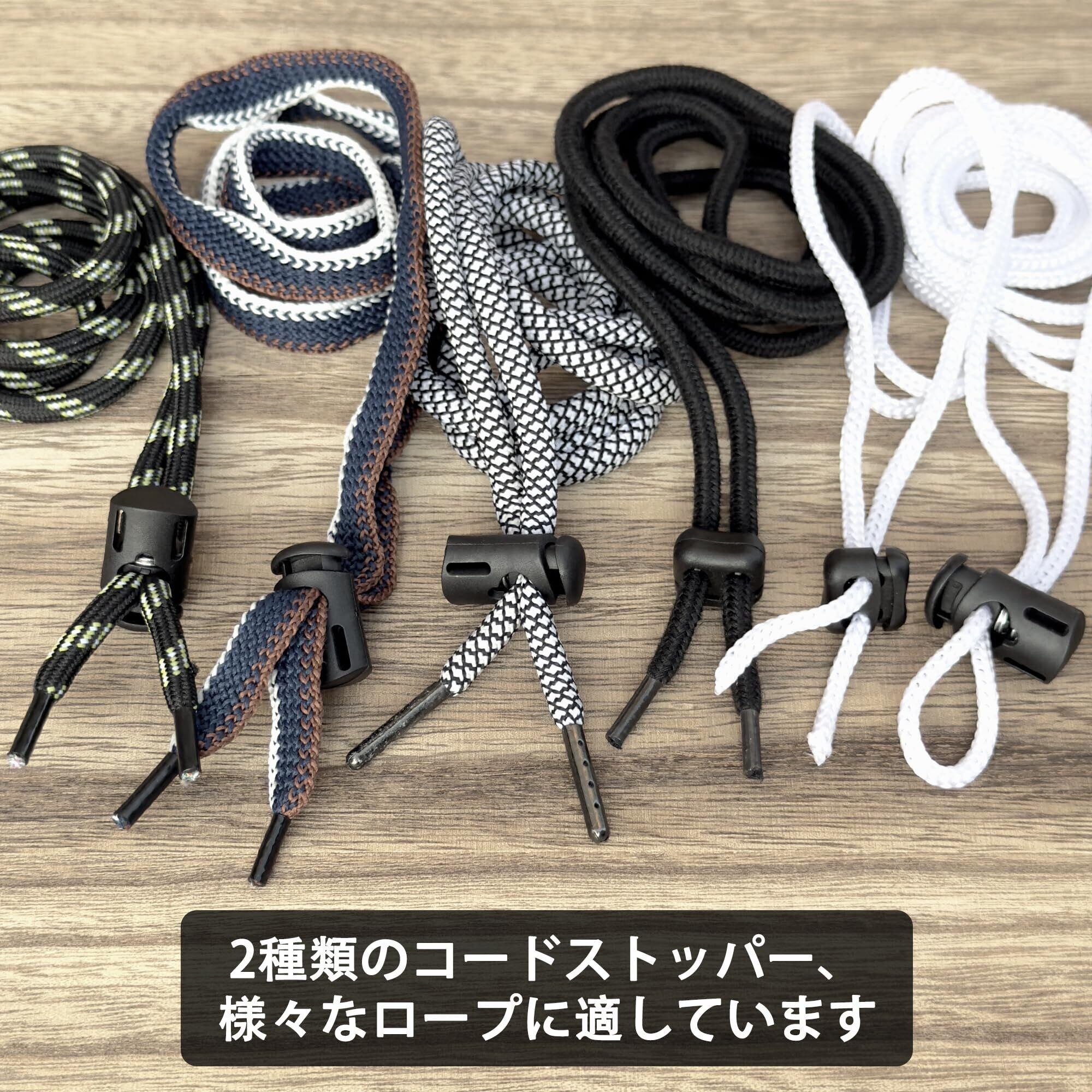 コードロック プラスチック製ロック 超軽量 アウトドア ゴム紐 耐久 2.5mm 10m 紐 ストッパー 1穴 2穴 各10個 スプリング コードストッパー 紐止め セット 21点 黒 B257240