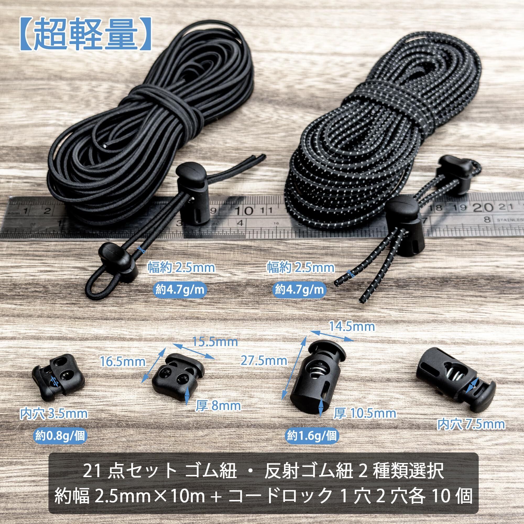 【21点仕様】アウトドア ゴムロープ 長約10m(幅約 2.5mm -4.7g/m、反射付き選択)、超軽量 丈夫 スプリング コードストッパー 1穴 1.6g/個 2穴 0.8g/個 各10個入り。