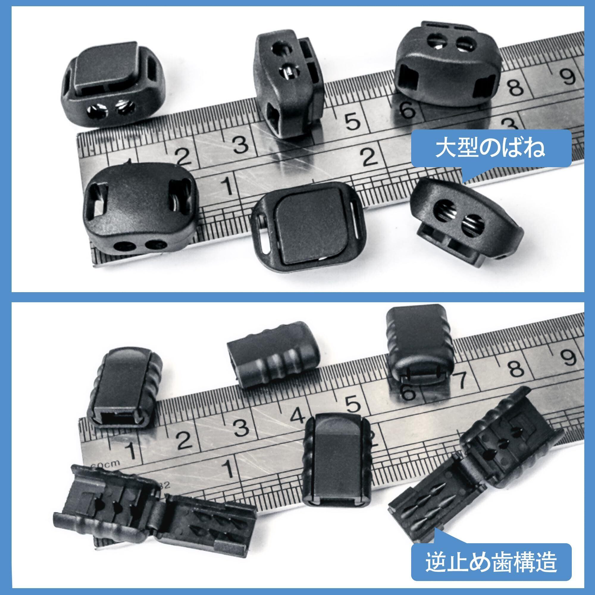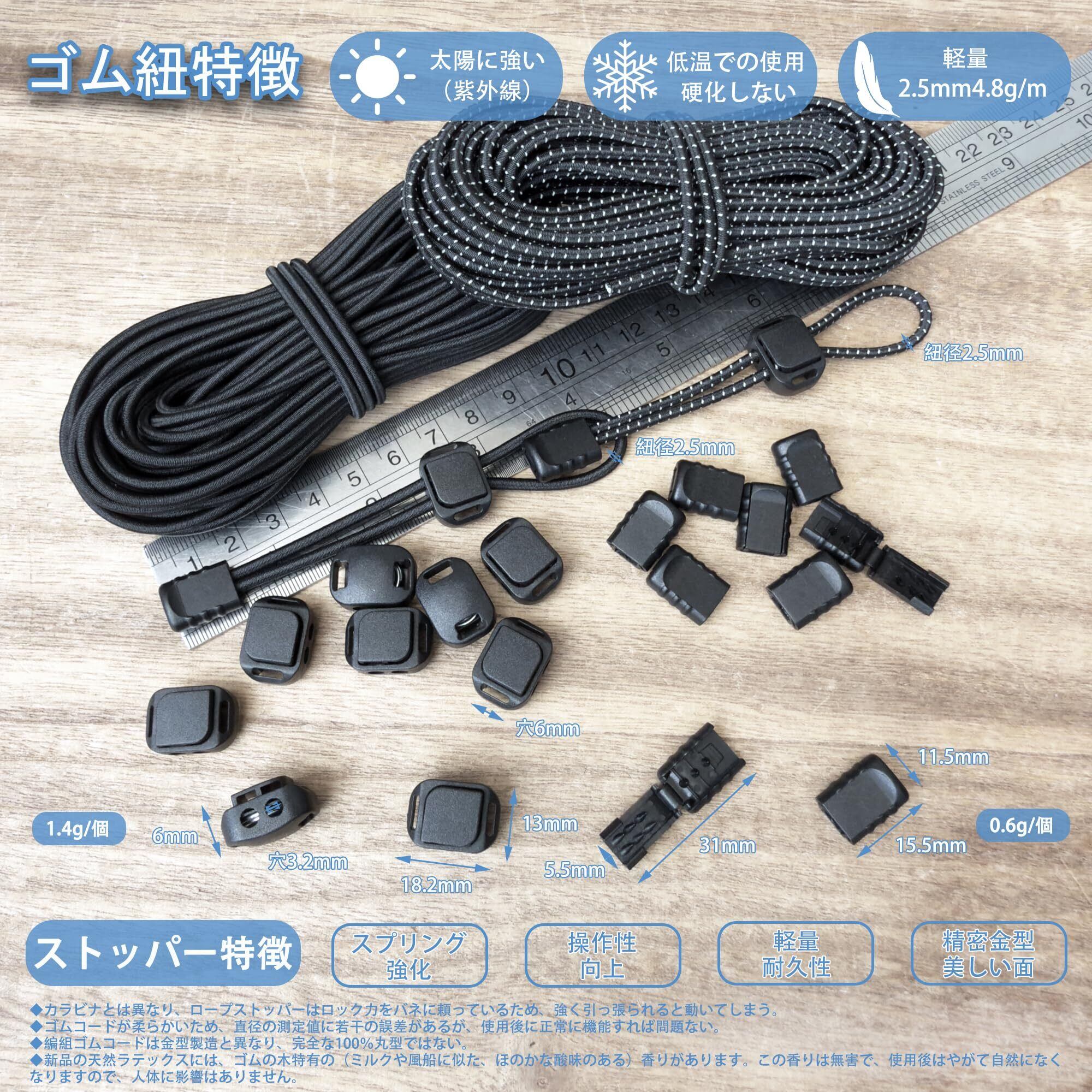 【21点仕様】強力 プラスチック スプリング コードストッパー(2つ穴径3.2mm1.4g/個)*10個、ロープエンド(穴幅5.5mm0.6g/個)*10個、アウトドア ゴムロープ 幅約2.5mm、長約10m、4.8g/m、反射付き選択。