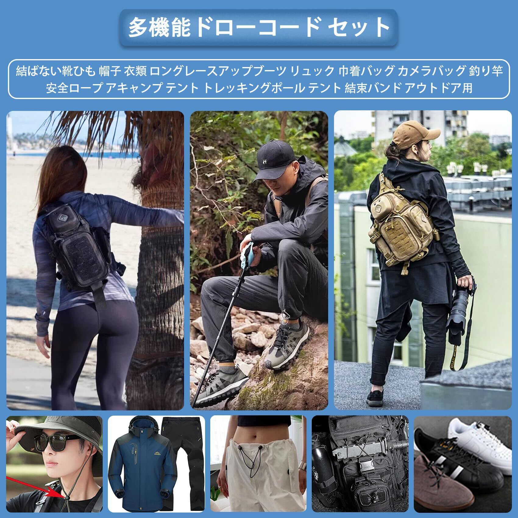 い。 【多用途】弾性は衝撃の吸収に役立ち、アウトドア 大活躍。帽子 衣類 靴紐 ロングレースアップブーツ リュック 巾着バッグ カメラバッグ 釣り竿 安全ロープ アキャンプ テント トレッキングポール 結束バンド。