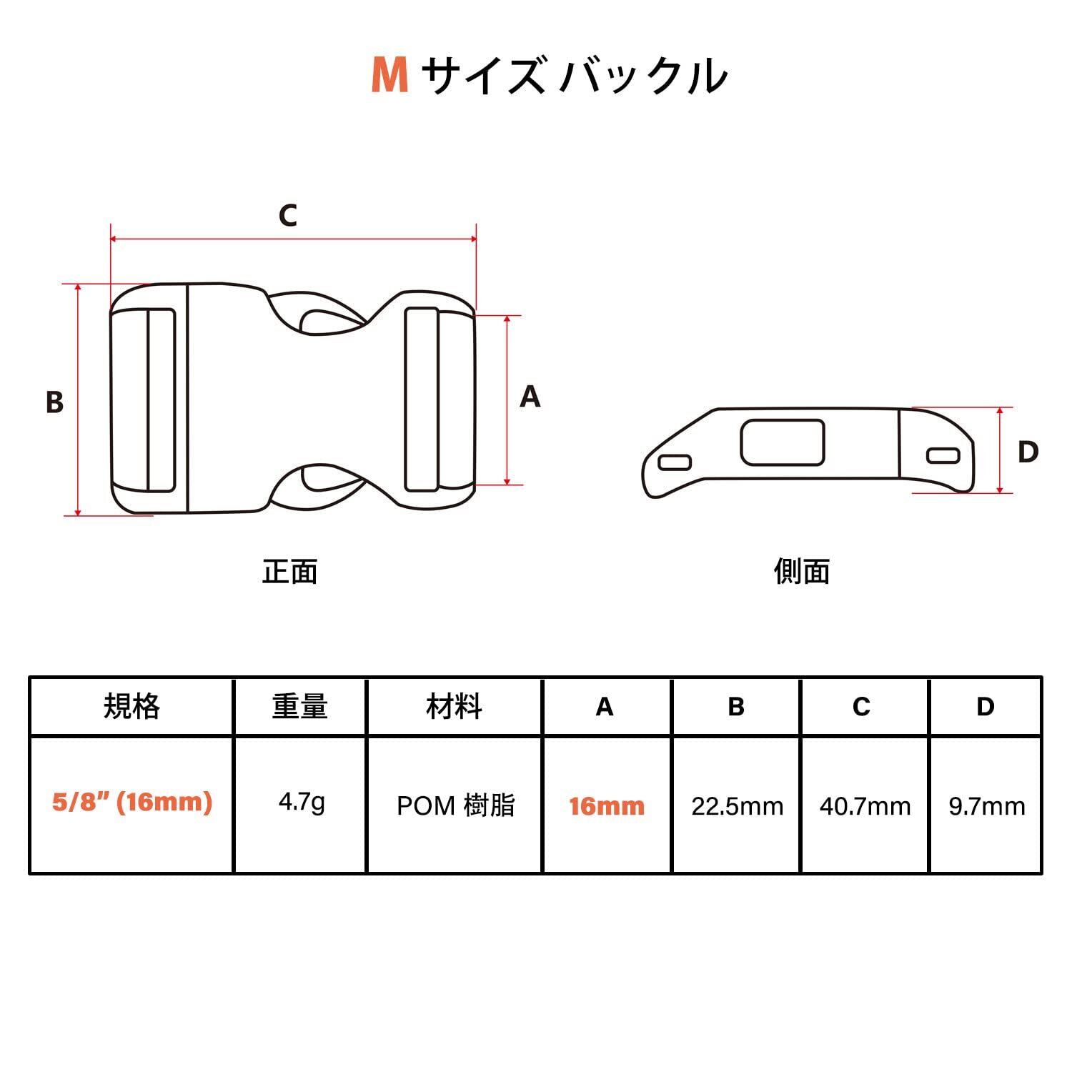 【製品仕様】Mサイズ サイドリリースタイプ、サイズ:内径 16mm(16mm幅のテープに対応)、外径 22.5mmx40.7mm、正味重量:4.7g/個、材質:プラスチック、セット内容:36個入り。