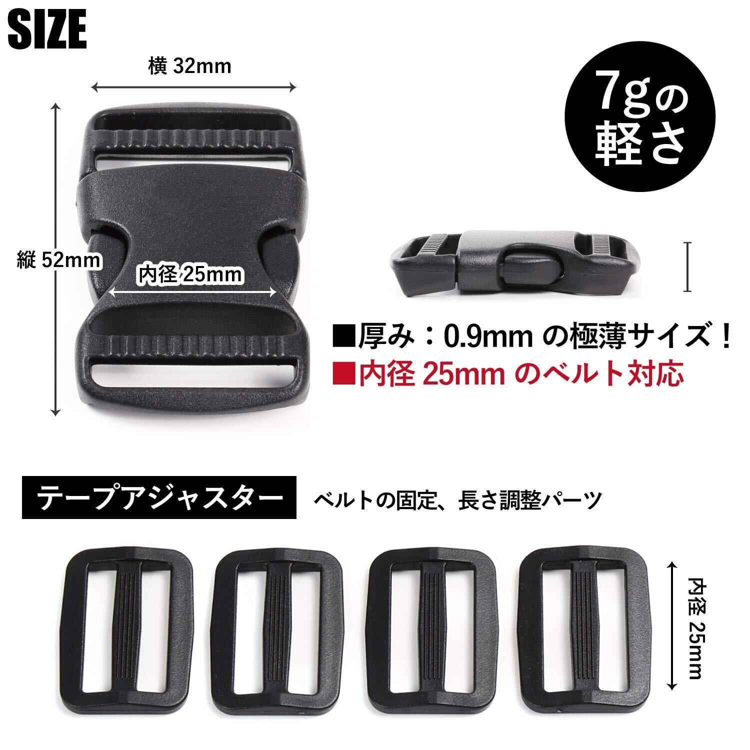 【タイプ】 両側で長さ調整機能を備えたタイプ(両引き) 【 バックル 2個入・テープアジャスター 4個入 】