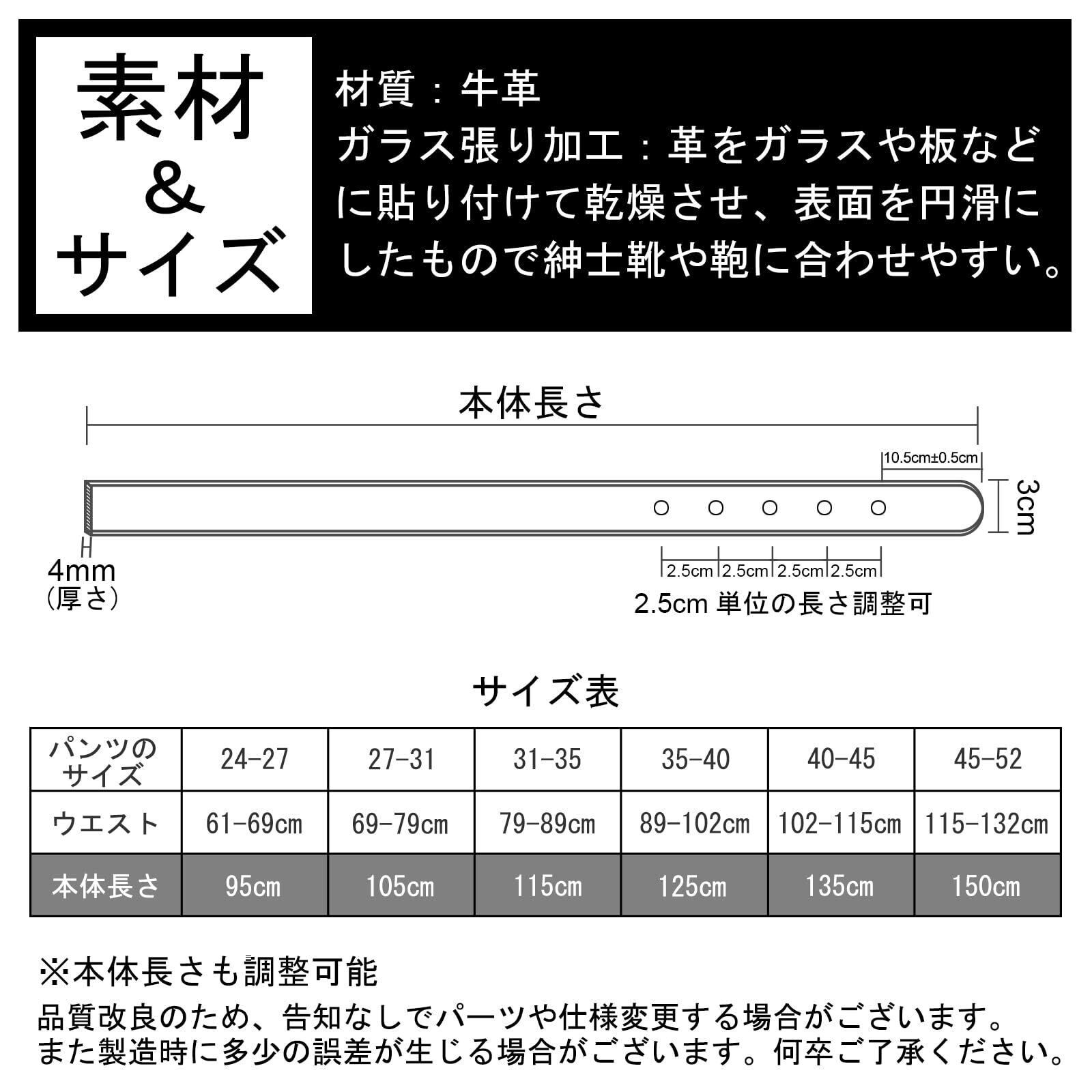 ベルト部分は肌触りが柔らかく、頑丈な牛革を使用。長さは105cm、120cm、125cmなどからお選びいただけます。バックルはピン式で高品質メッキの合金素材を使用。