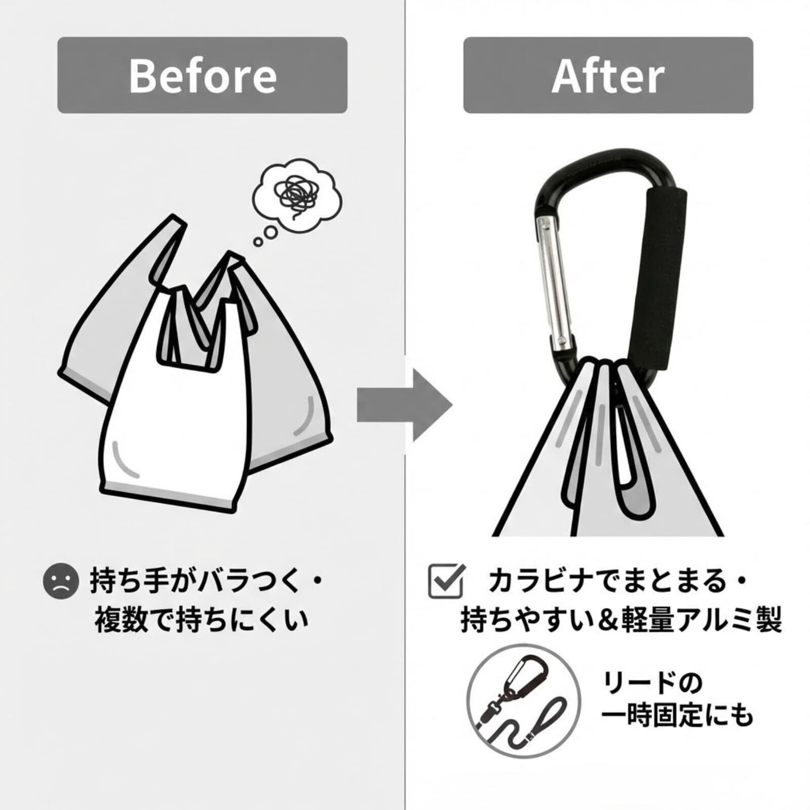 【お散歩や買い物袋の持ち手に】 ペットのリードを一時的に固定したり、重い買い物袋をまとめて持つのに便利!