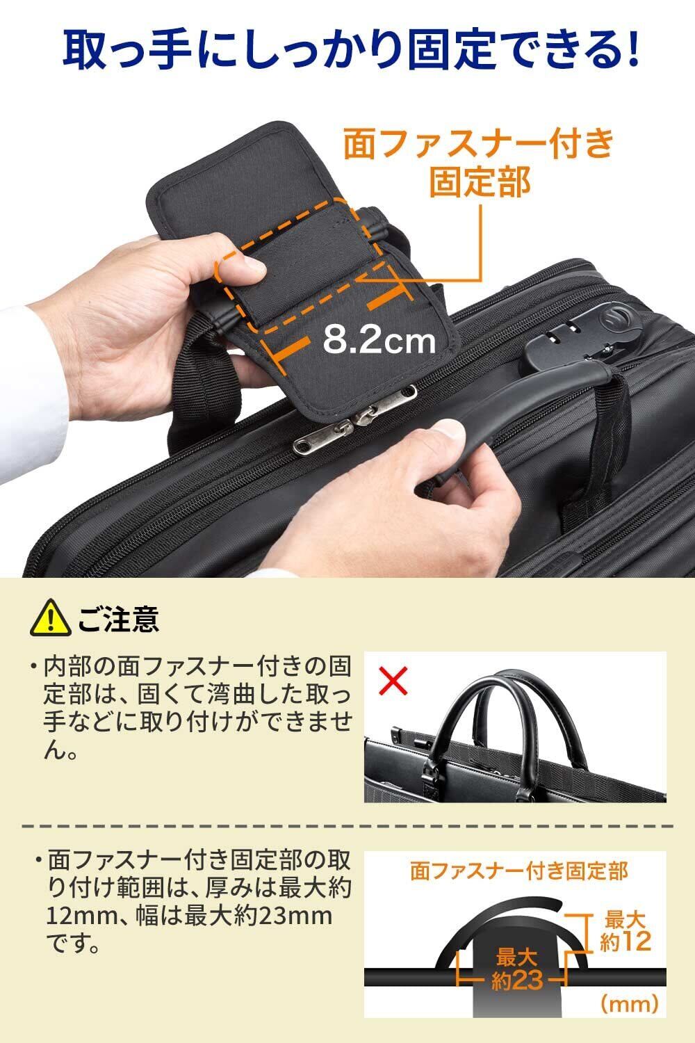 面ファスナー付きの固定部を、取っ手の片側に取り付けできしっかりと固定できます。