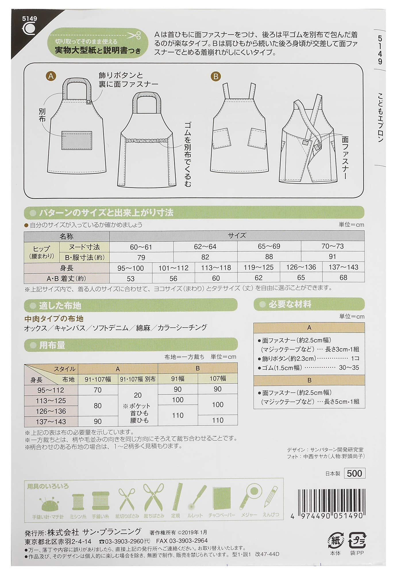 サン・プランニング 型紙 パターン フィットパターン サン こどもエプロン 5149