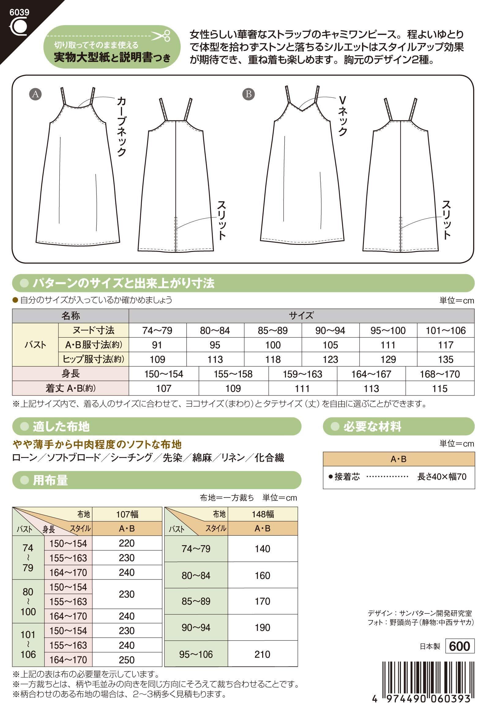 サン・プランニング 型紙 パターン シンプルキャミワンピース 6039