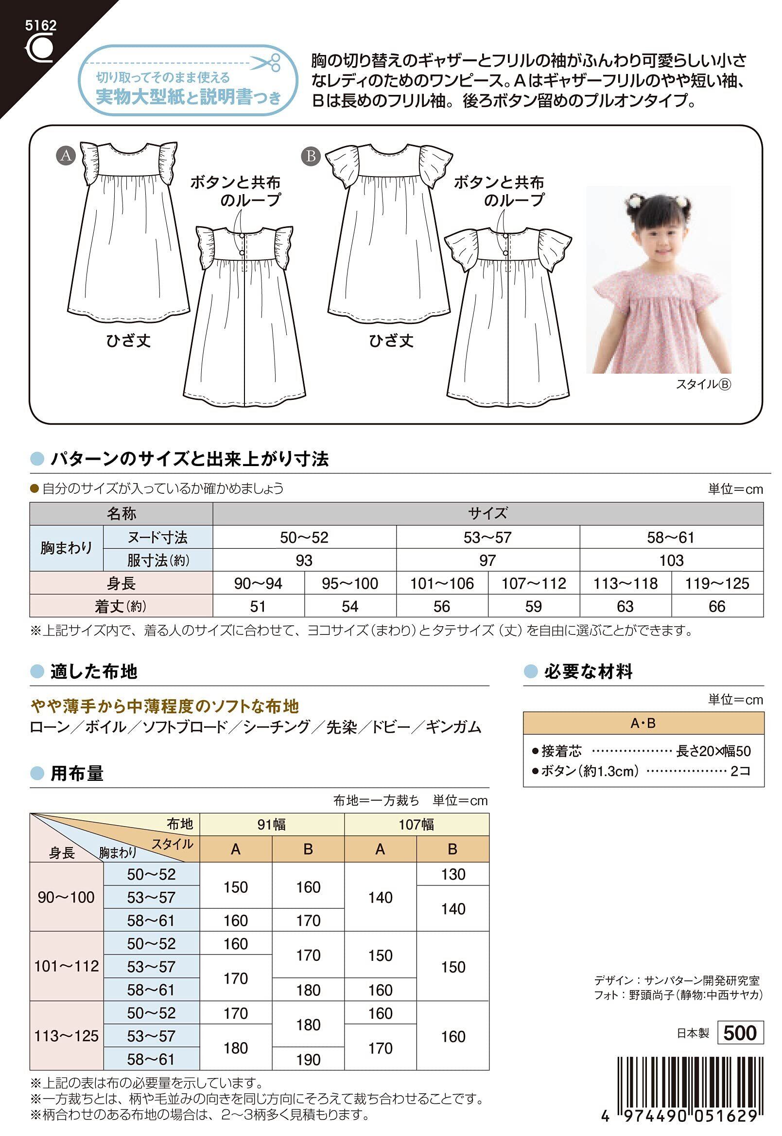 サン・プランニング 型紙 パターン こどもフリル袖ワンピース 5162