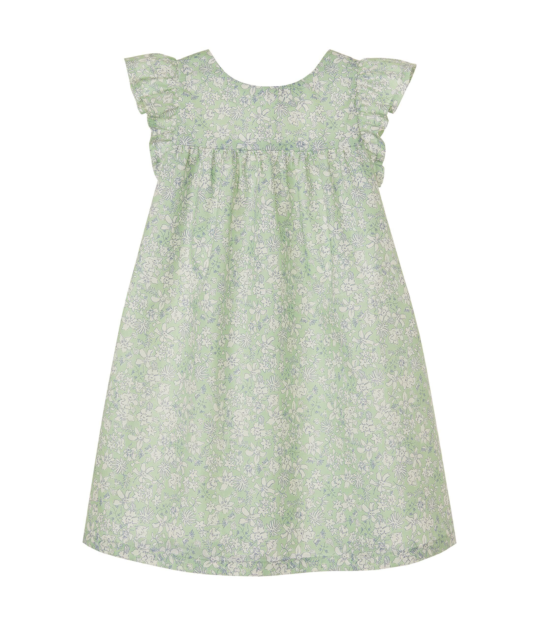 胸の切り替えのギャザーとフリルの袖がふんわり可愛らしい小さなレディのためのワンピース。Aデザインはギャザーフリルのやや短い袖、Bデザインは長めのフリル袖。後ろボタン留めのプルオンタイプ(かぶりタイプ)。