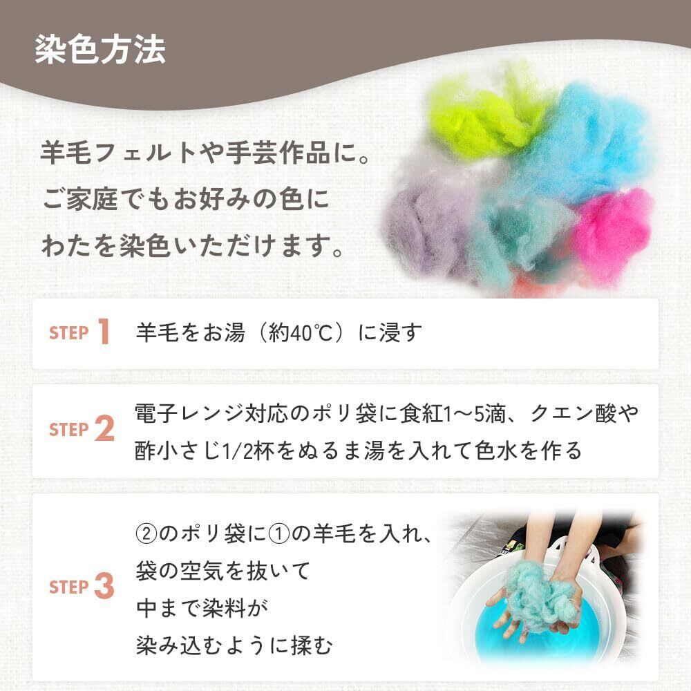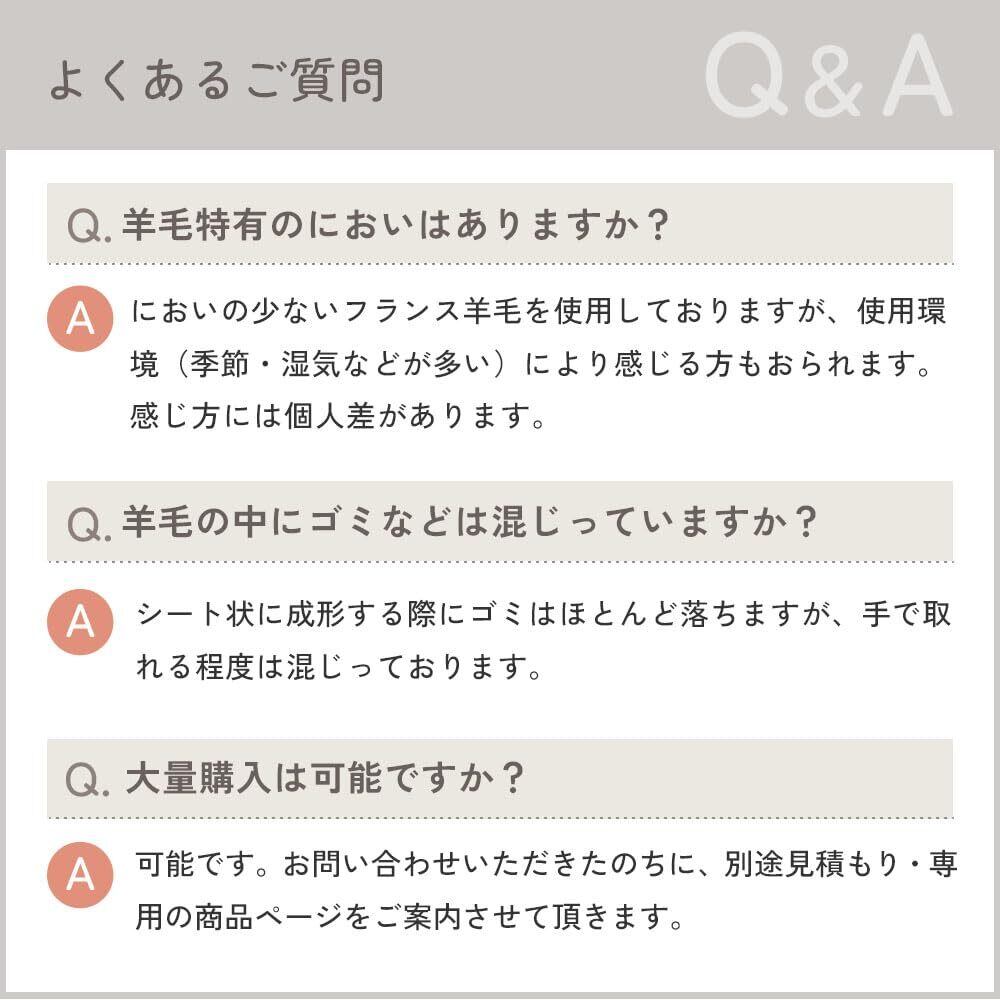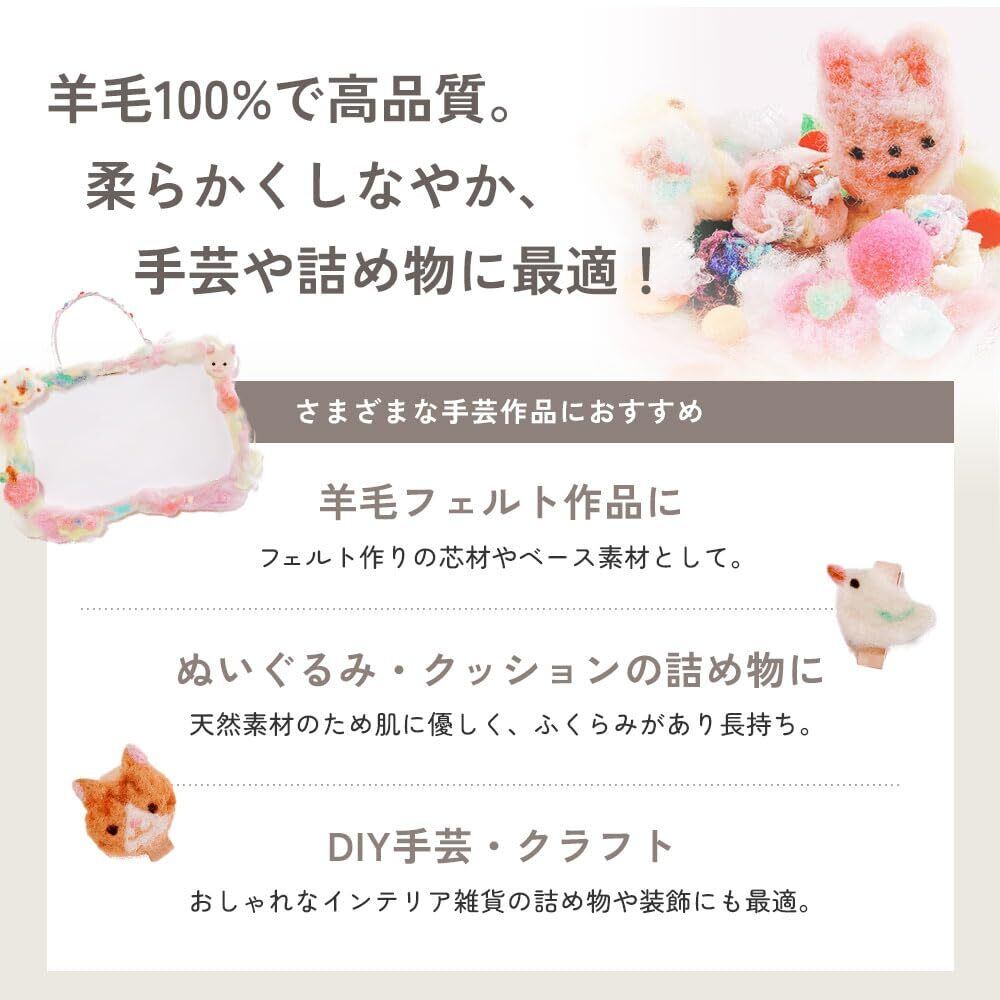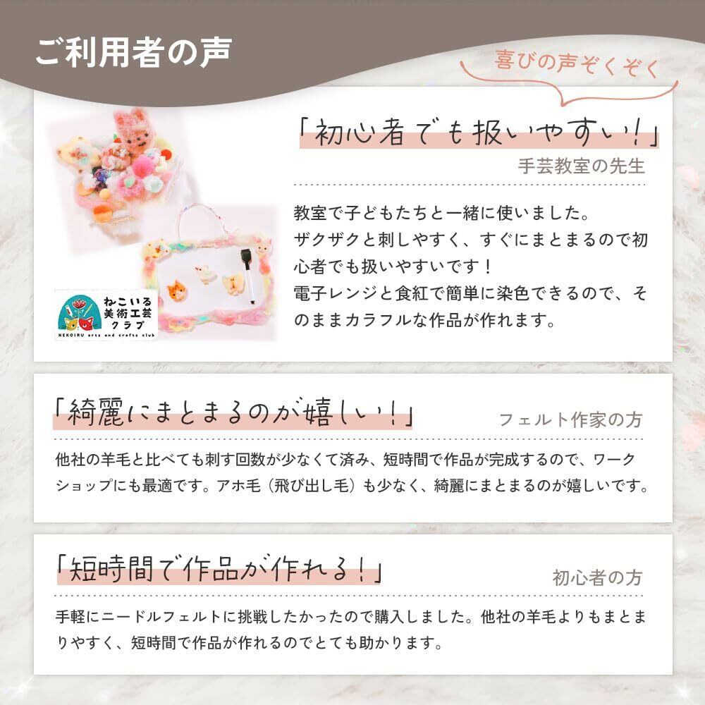 ■羊毛シート・高品質のフランス羊毛100%。嫌な臭いの少ない高品質のフランス産の羊毛を使用しています。油脂分、弾力性、繊維の長さ等の検査基準をクリアしたゴールドラベル付のウールです。その羊毛を眠り姫で成形しています。品質保証付きで安心してご使用いただけます。(日本製)※天然繊維ですので、若干異物が混ざっている場合もあります。あらかじめご了承願います。・加工しやすいシートタイプ。羊毛を成形後シート状に仕上げています。ニードルを軽くさすだけでまとまりやすくほどよい硬さ仕上がります。電子レンジと食紅で簡単に染色できるので、そのままカラフルな作品が作れます。アホ毛(飛び出し毛)も少なく、綺麗にまとまります。 手芸綿としてだけでなく、ちぎれやすく、扱いやすいので、いろいろな中綿にも使用できます。