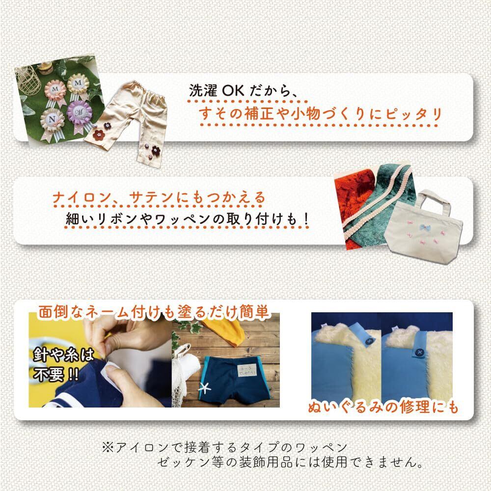 【使用用途】・名札やリボンの接着に ・通園バッグ等の製作に ・ズボンやスカートの裾上げに ・ナイロン、サテンにも接着可能