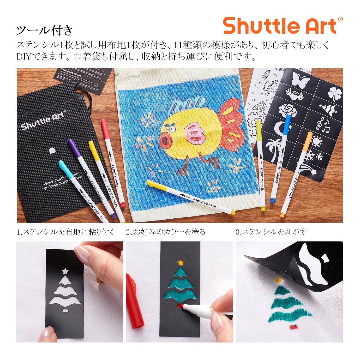 Shuttle Art 布用 ペン 28色セット 布に書けるペン ファブリックマーカー 水性 耐水 耐久 ウォッシャブル 洗っても落ちない 色褪せしにくい 乾燥まで速い ステンシル付き DIY ハンドメイド 手作り イラスト 落書き スニーカー Tシャツ カンバス 子供