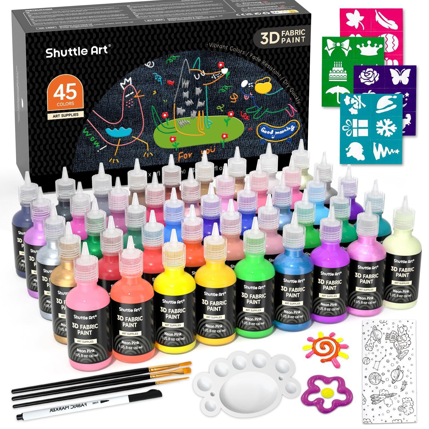 Shuttle Art 布用絵の具 3D 立体 45色セット 30ml 布えのぐ ファブリックペイント メタリックカラー ウォッシャブル 洗っても落ちない 耐久 ペイントブラシ・ステンシル・パレット付き DIY イラスト 落書き Tシャツ カンバス スニーカー 子供 プレゼント