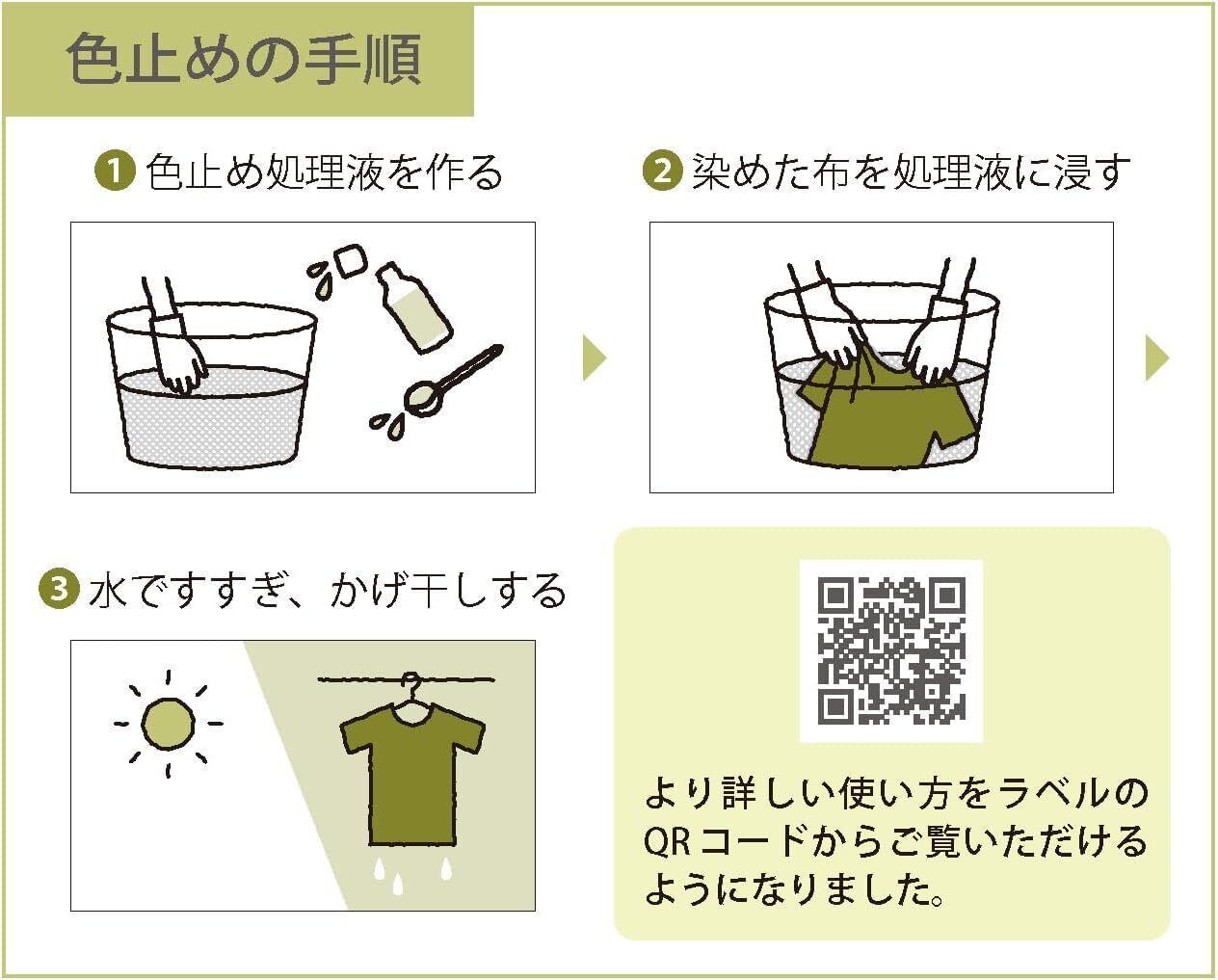 低温(30℃以上)で手軽に染められる染料と綿麻レーヨンを染色をした後、使用する色止め剤のセットです。