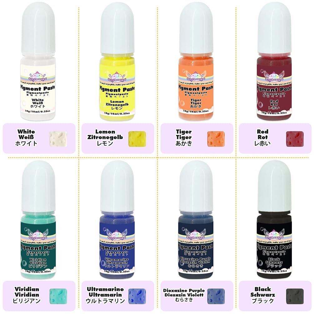 好きなモチーフでむにゅむにゅスクイーズを自作できるスクイーズレジン専用のカラーペーストです。黒、白、あかき、赤、ウルトラマリン、ビリジアン、紫、レモンの基本色が含まれています。