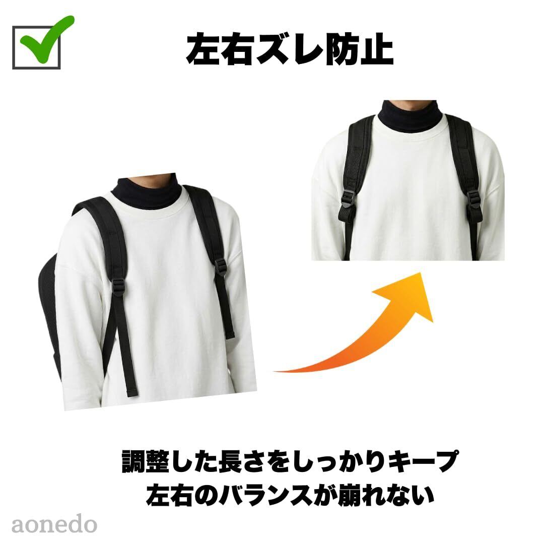 【左右ズレ防止】リュックの肩ヒモの長さをしっかり固定。持ち上げた時や使用中に長さが変わるのを防ぎます。左右のバランスが崩れず、調整したベストなフィット感をキープ。毎回の再調整の手間もなく快適です。
