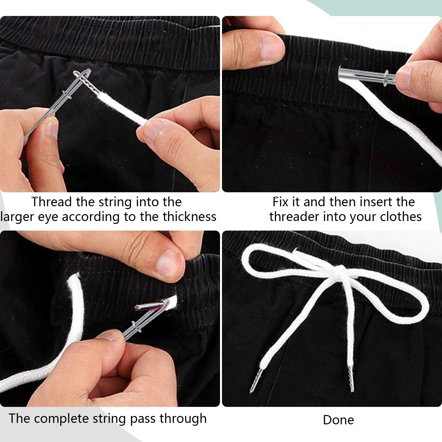 使用方法:紐の太さに応じて、太い方の穴に紐を通し、固定した後、スレッドを衣類に挿入し、紐が完全に通るまで進めます。