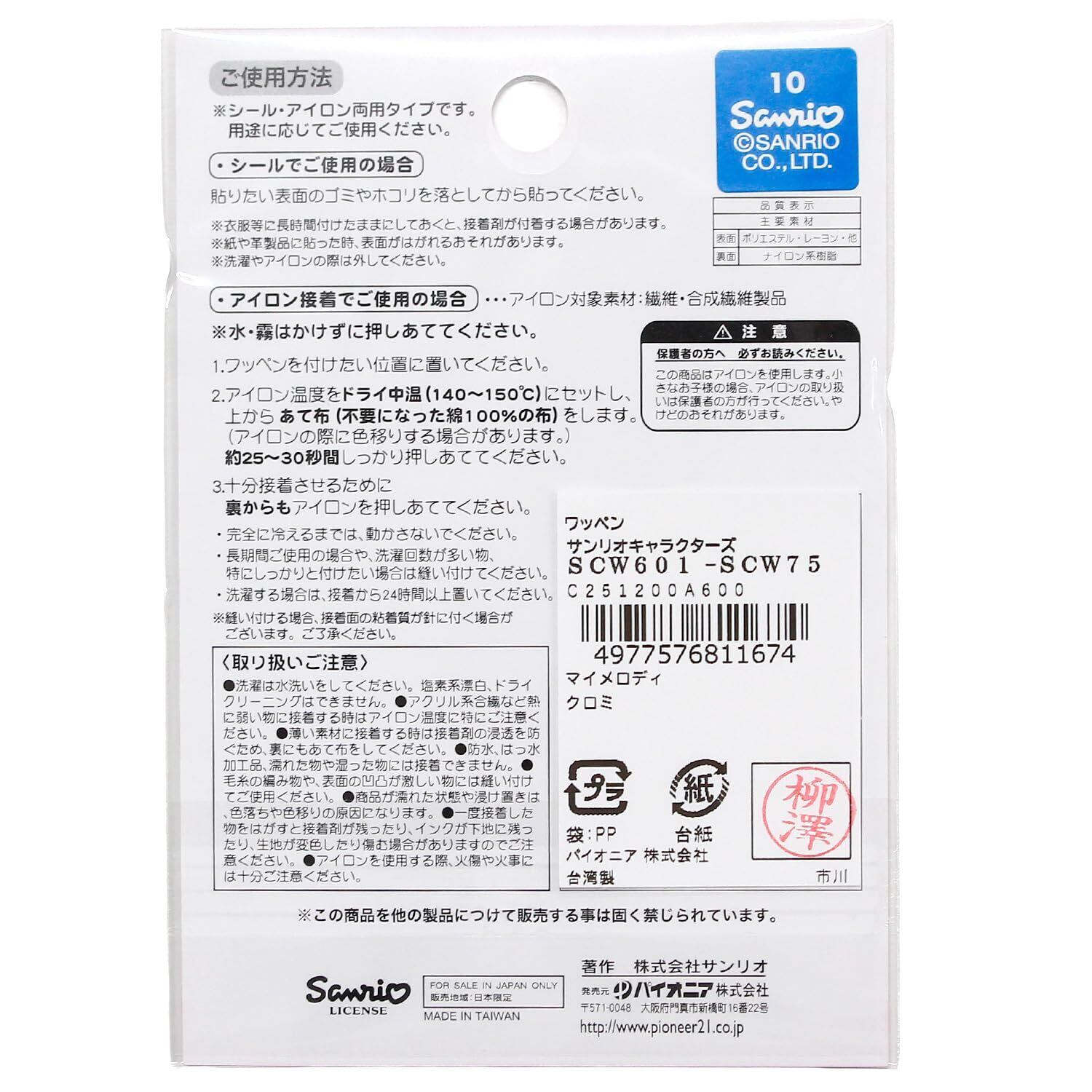パイオニア Sanrio characters Happy Friendships マイメロディ クロミ ワッペン 1枚 横55mm×縦43mm シール アイロン 両用接着 SCW601-SCW75