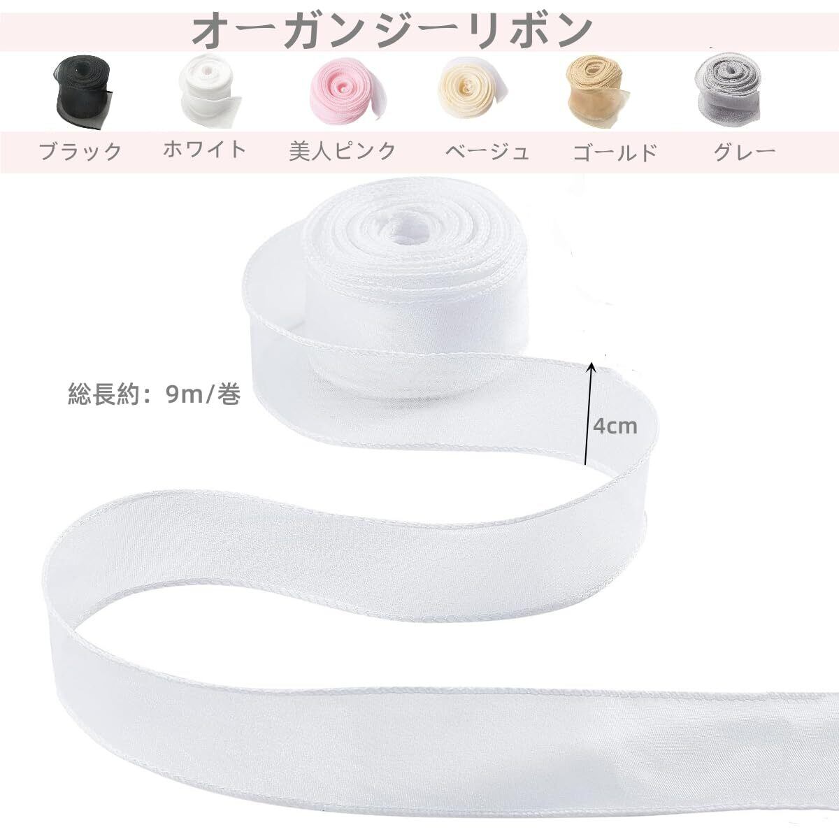 【商品仕様】オーガンジーリボン3巻入り、サイズ: 長さ約9m ×幅 4cm。