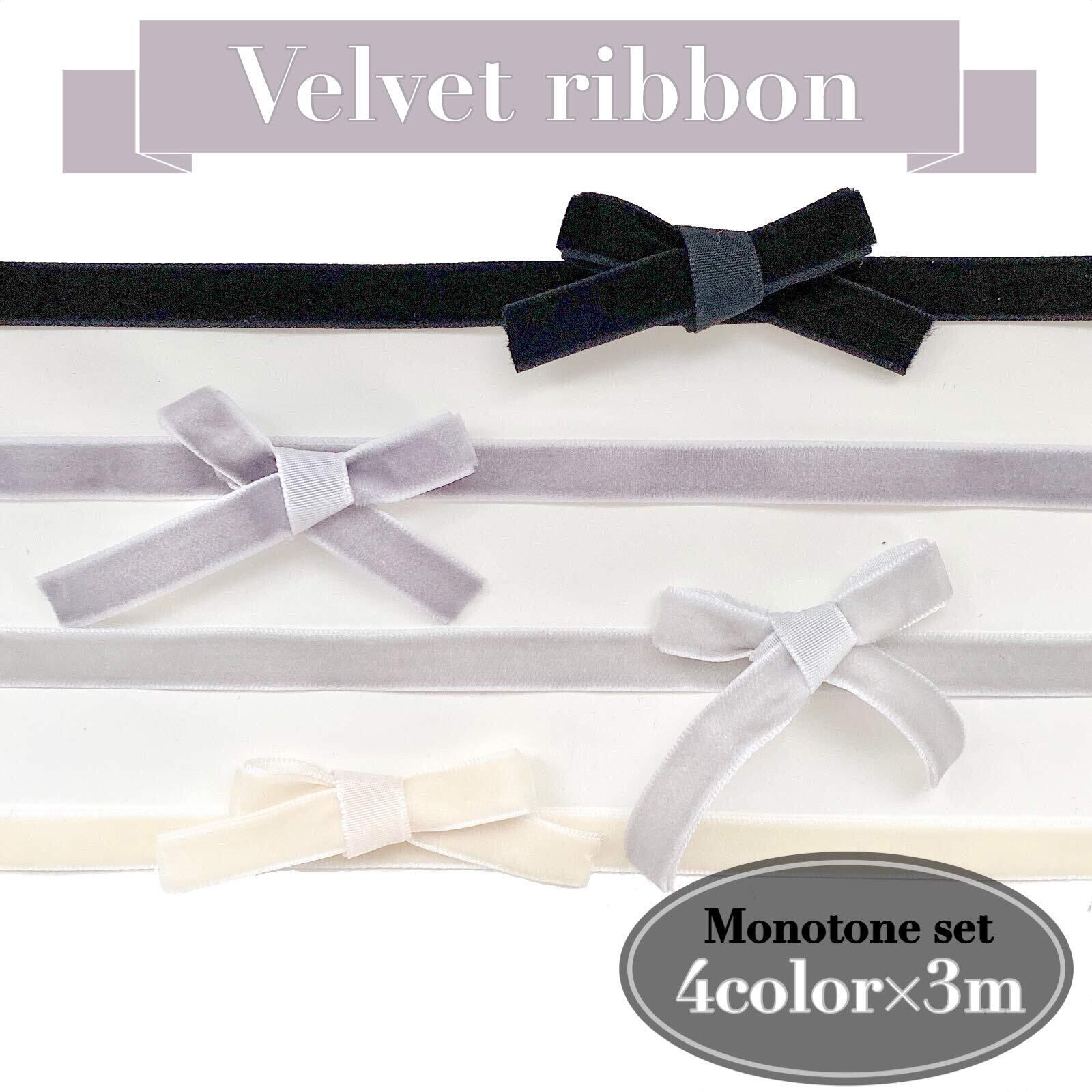 【新着商品】10mm幅 各3m 片面 ベルベット リボン ベロア 4色セット 手芸 ラッピング (モノトーン)
