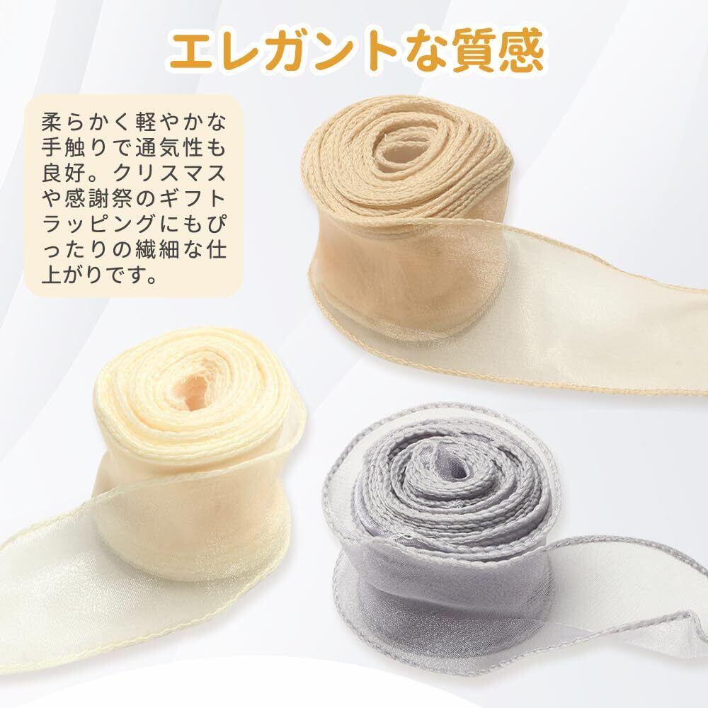 【商品仕様】オーガンジーリボン3巻セット サイズ:長さ約9m×幅4cm 【高品質素材】上質なオーガンジー生地を使用し、美しく装飾性に優れています。DIYや手芸のデコレーションに最適で、耐久性も抜群です。 【自由にカット可能】お好きな長さにカットして使え、繰り返し利用が可能です。お祝いの場や季節のイベントに華やかさをプラスします。 【エレガントな質感】柔らかく軽やかな手触りで通気性も良好。クリスマスや感謝祭のギフトラッピングにもぴったりの繊細な仕上がりです。 【多用途に使える】服飾の裾やスカート、カーテンの装飾からアクセサリー作り、ギフト包装、結婚式のデコレーション、花束やギフトボックスのラッピングまで幅広く活躍します。