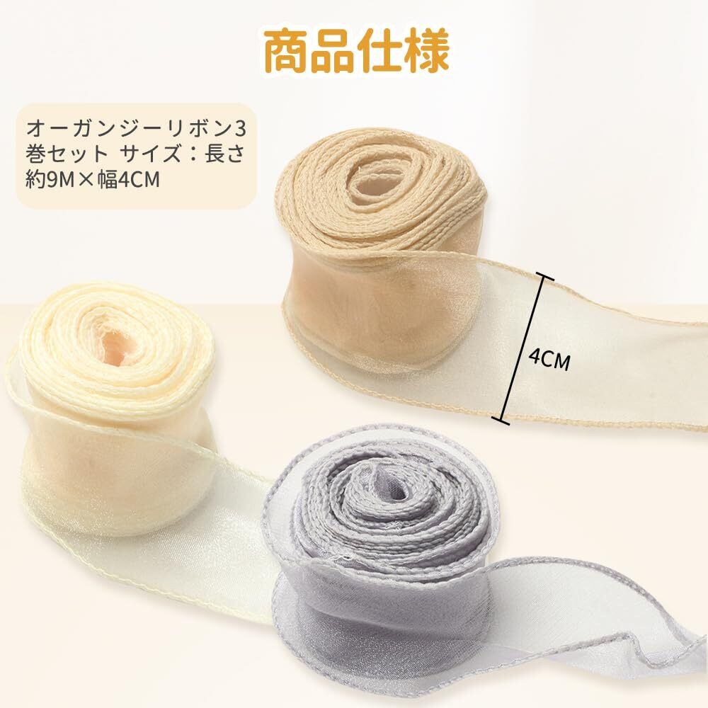 リボン オーガンジーリボン 長さ約9m 幅4cm 3巻セット(グレー・ゴールド・ベージュ) 手芸用 ラッピング バレンタイン ギフト 花束 結婚式 パーティー装飾 ヘアアクセサリー DIY