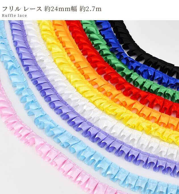 存在感のあるボリュームたっぷりのフリルで、推し活グッズをより華やかに!豊富なカラーバリエーション10色!ゆめかわいい色合いからビビットカラーまで、あなたの推し色もきっと見つかります。さらに約2.7m入っていますので、たっぷりご利用いただけます。接着剤や両面テープで貼り付けるだけで簡単!硬質ケース・フォトフレーム、うちわのデコレーションや、ロゼッタ作りなどにおすすめのサイズ。もちろん、ゆめかわな作品やお子様のドレス・衣装ポーチやバッグなど、様々な装飾としてお使いいただけます。
