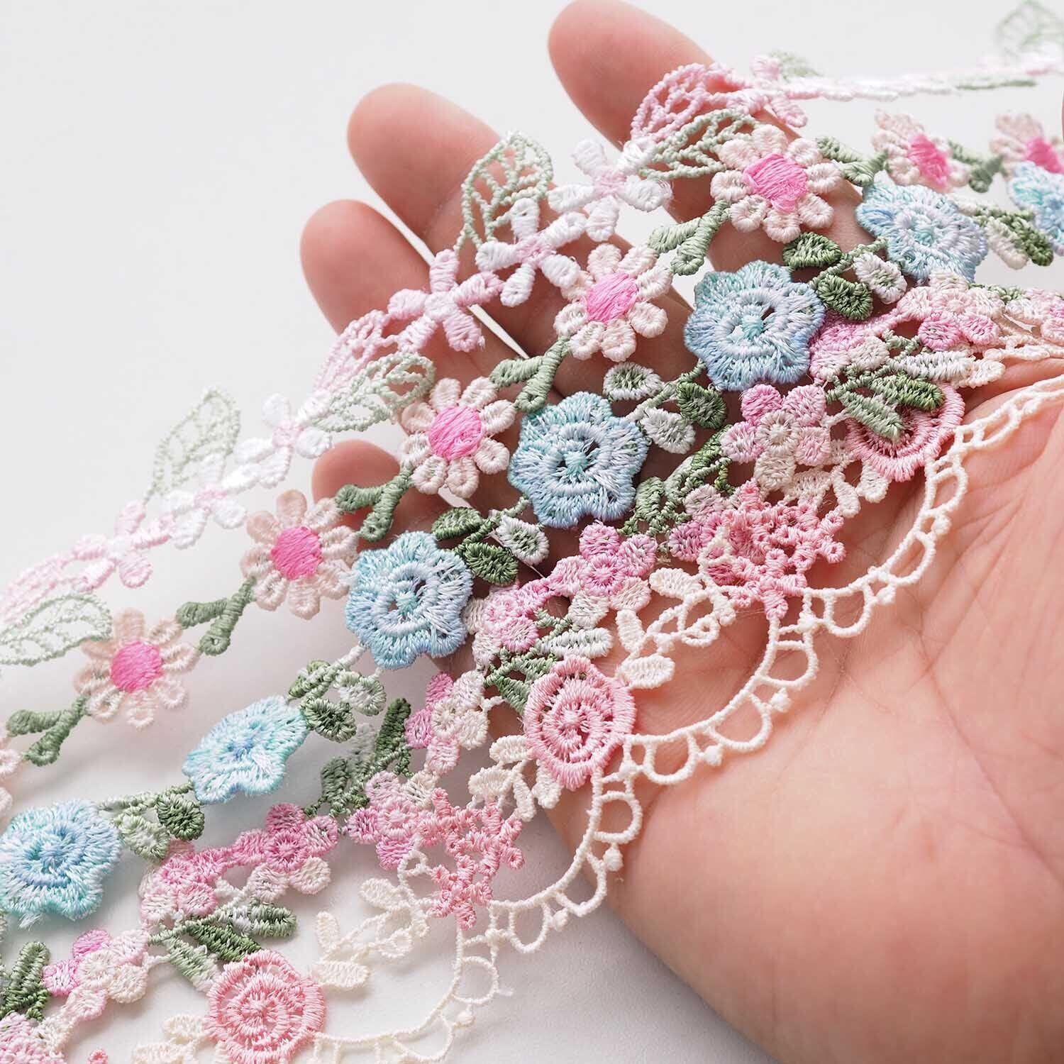 5種類のカラーレース生地がセットになったコース、幅が25mm、20mm、15mmの3つのサイズ展開で、それぞれ約1mの長さがあります。カラフルなフラワーデザインは、髪飾りやDIYプロジェクト、衣装の装飾など、多目的にご使用でき。