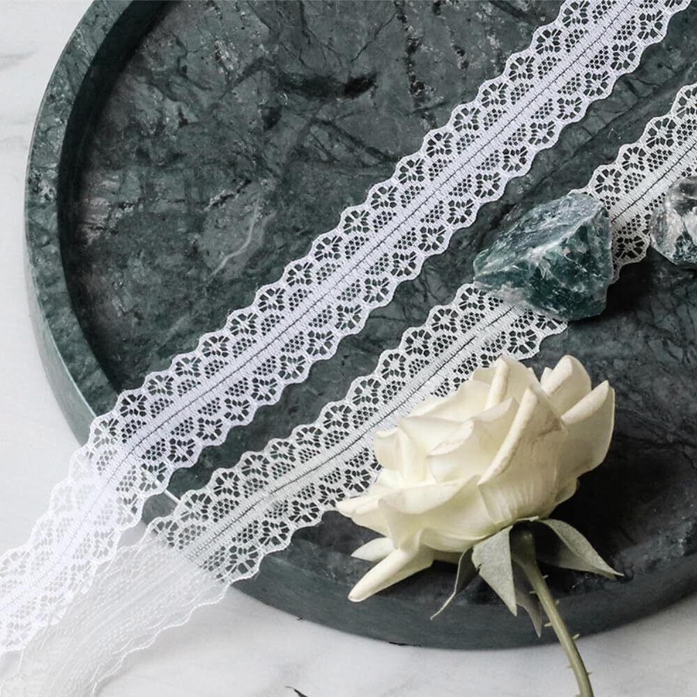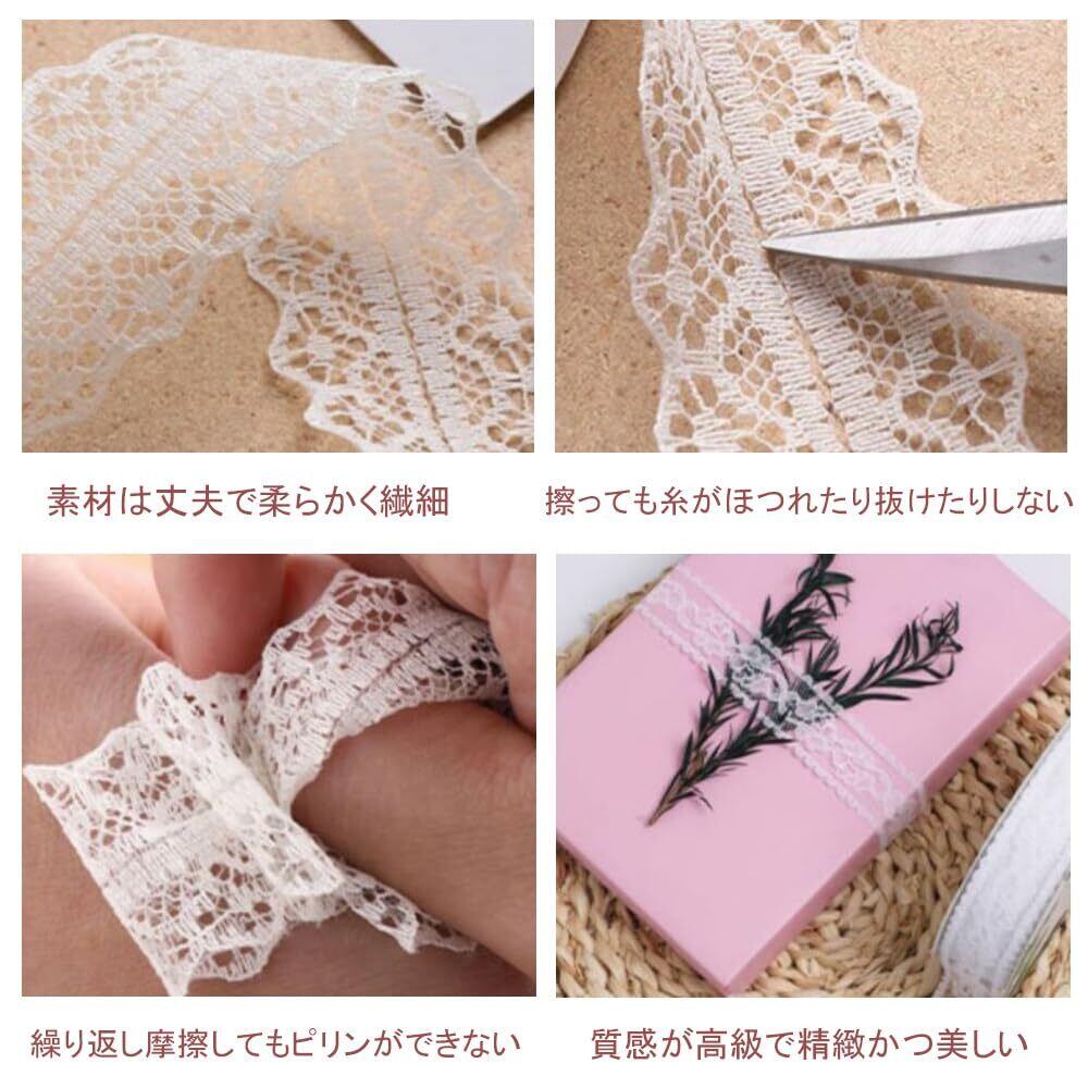 【高品質な素材】レースリボンはポリエステル素材で作られており、丈夫で長期にわたって使用できます、耐摩耗性が高く、切り取りや加工を繰り返しても傷みにくいです。レースの模様ははっきりとしており、美しい透明感を演出します、この素材は軽量で通気性が良く、使いやすさを追求しています。