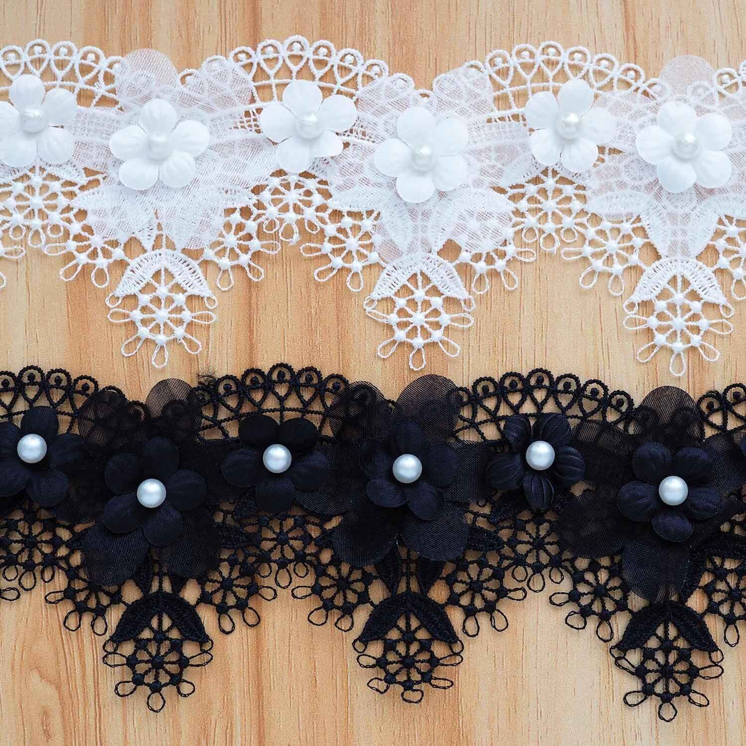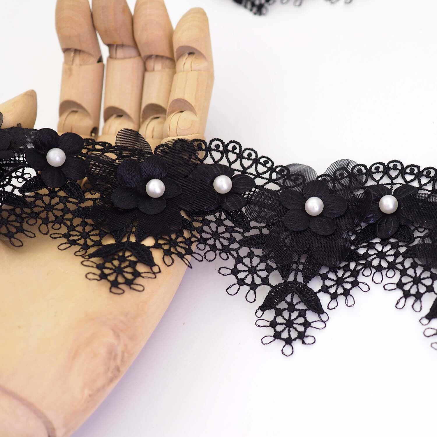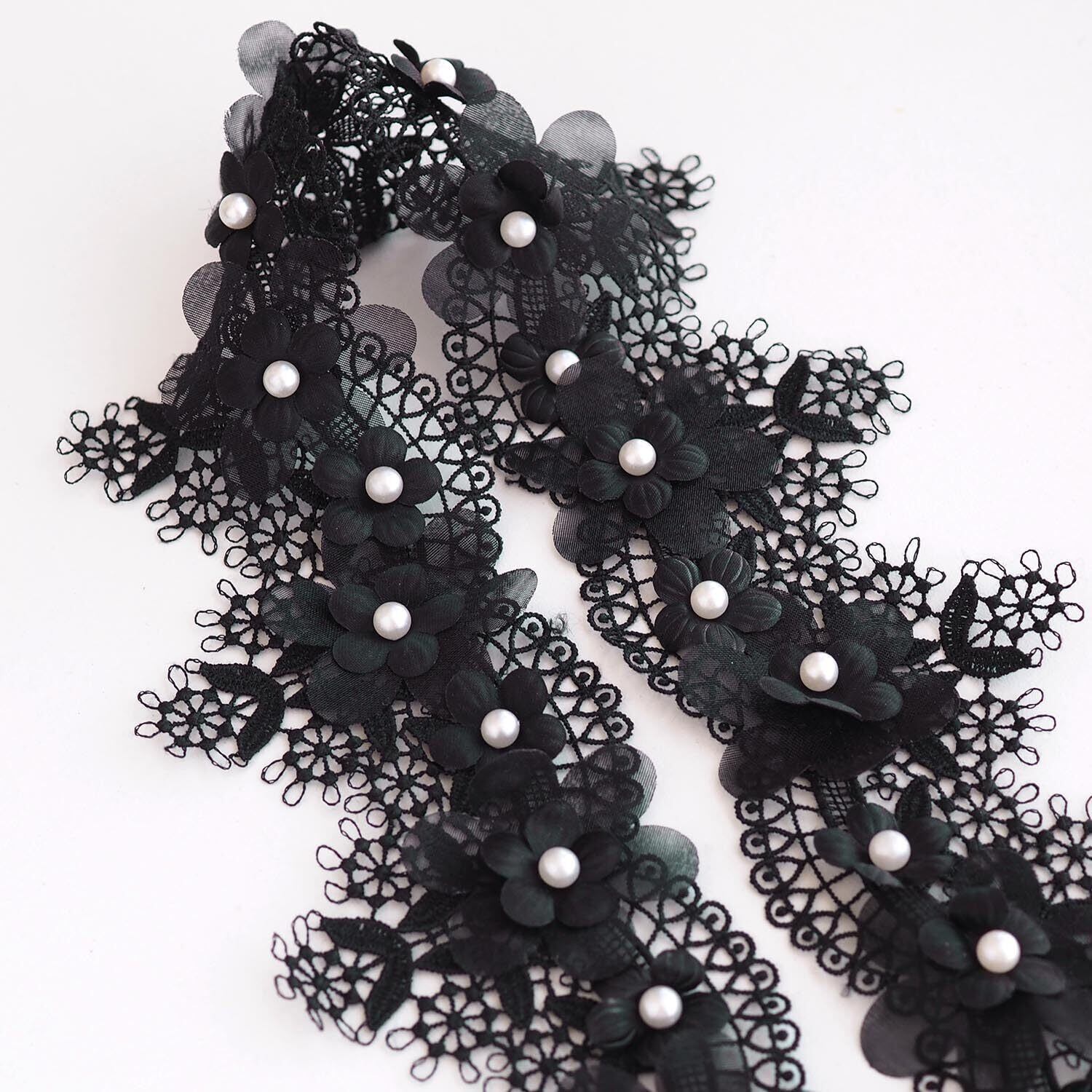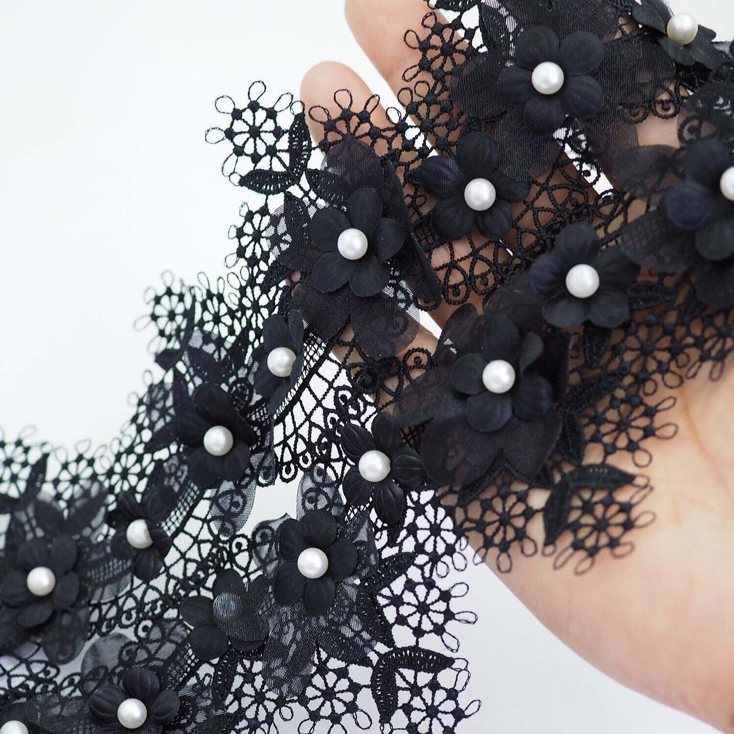 【特価セール】幅7cm(長さ1m) 縫い物用の装飾レース 生地 刺繍花 ,パールで飾られた花柄のレースで、DIYや手作り、工芸品、缝製、衣料品やインテリアの装飾に最適 (ブラック)