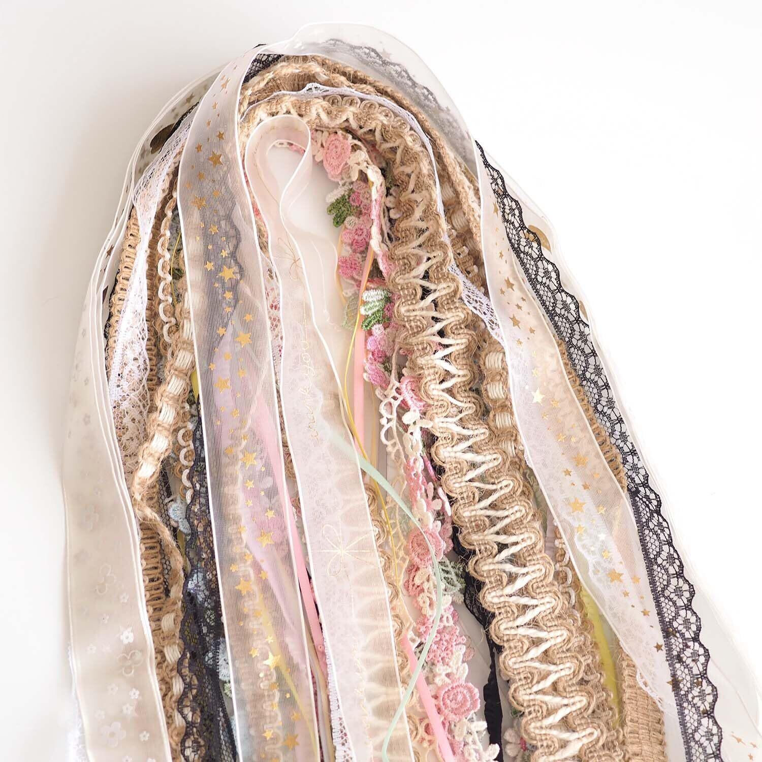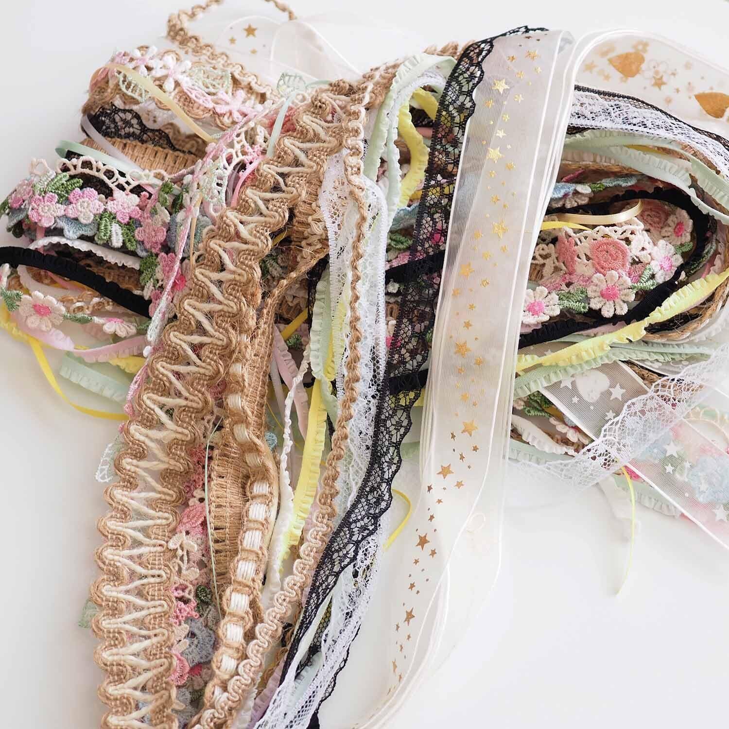 カラフルレース&ヴィンテージ風リボン混装セットは、全30ヤード・30種類のデザインを詰め合わせたクラフト素材です。花柄、星柄、繊細な刺繍入りなど、個性豊かなレースとレトロ感あふれるリボンがDIYやハンドメイド作品を華やかに彩ります。
