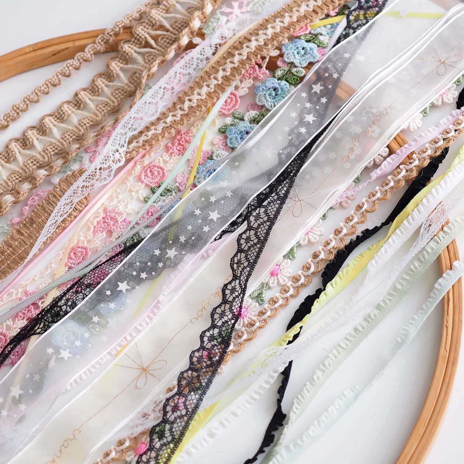 【カラフル&ヴィンテージデザイン】: 華やかな花柄、キュートな星柄、繊細な刺繍入りレースなど、カラフルな色使いとレトロ感のあるリボンが作品をワンランクアップさせます。